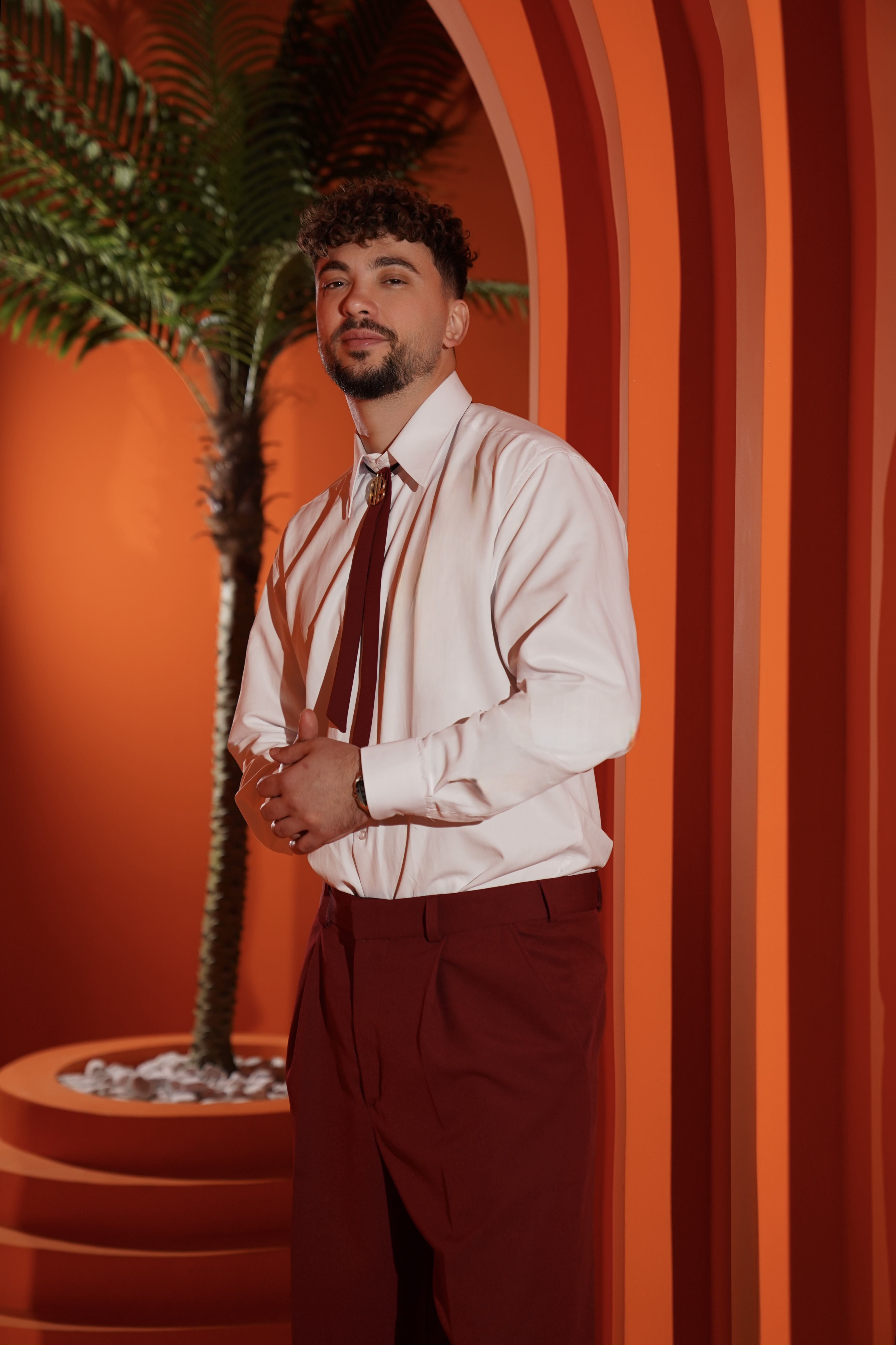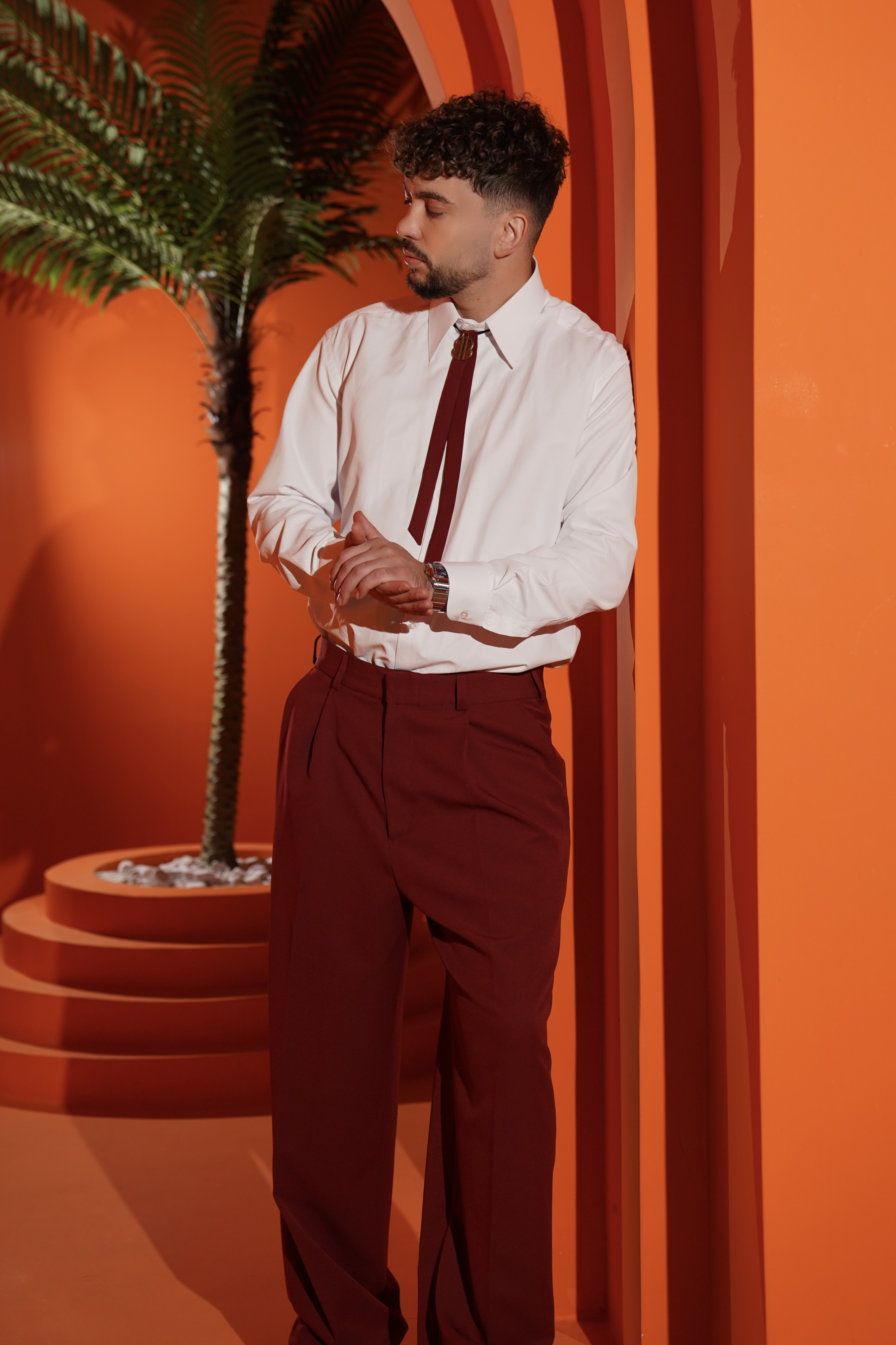 Këmishë: E bardhë, prerje 'slim-fit'. Pantallona: Ngjyrë bordo (burgundy) me material të lehtë. Aksesor: Kravatë e stilizuar që përputhet me pantallonat.