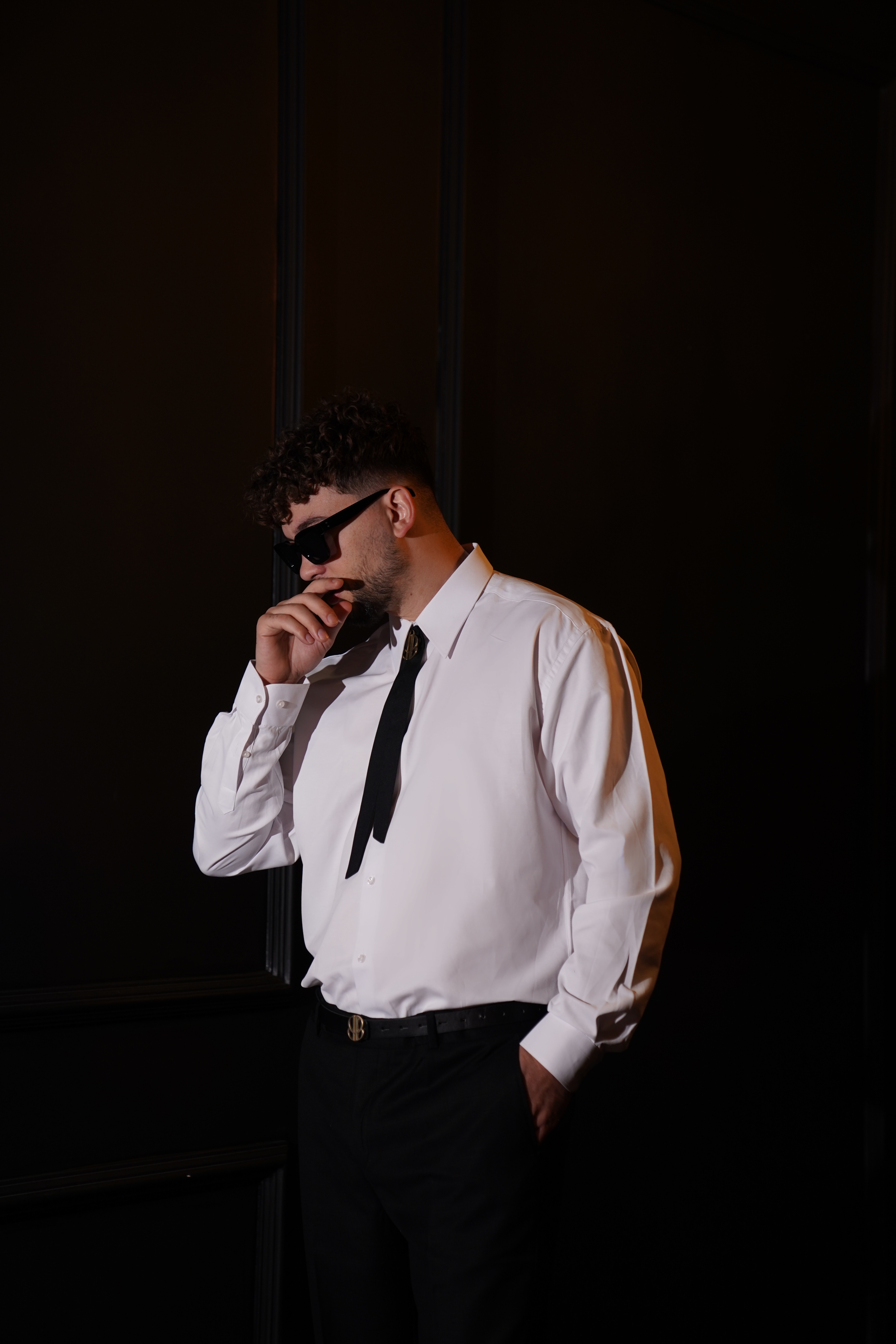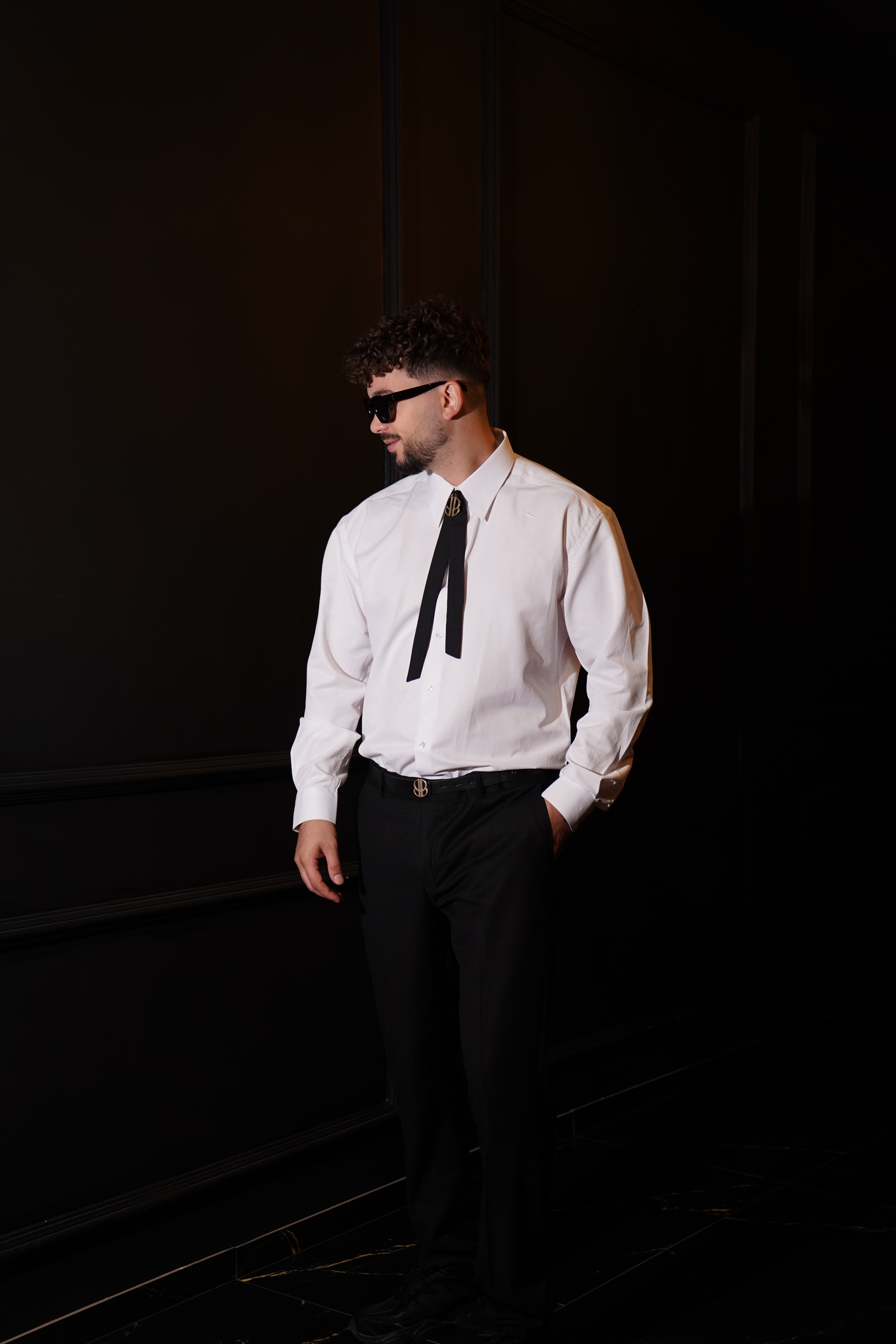 Këmishë: E bardhë, prerje 'slim-fit'. Pantallona: Ngjyrë të zezë me material të lehtë. Aksesor: Kravatë e stilizuar që përputhet me pantallonat.