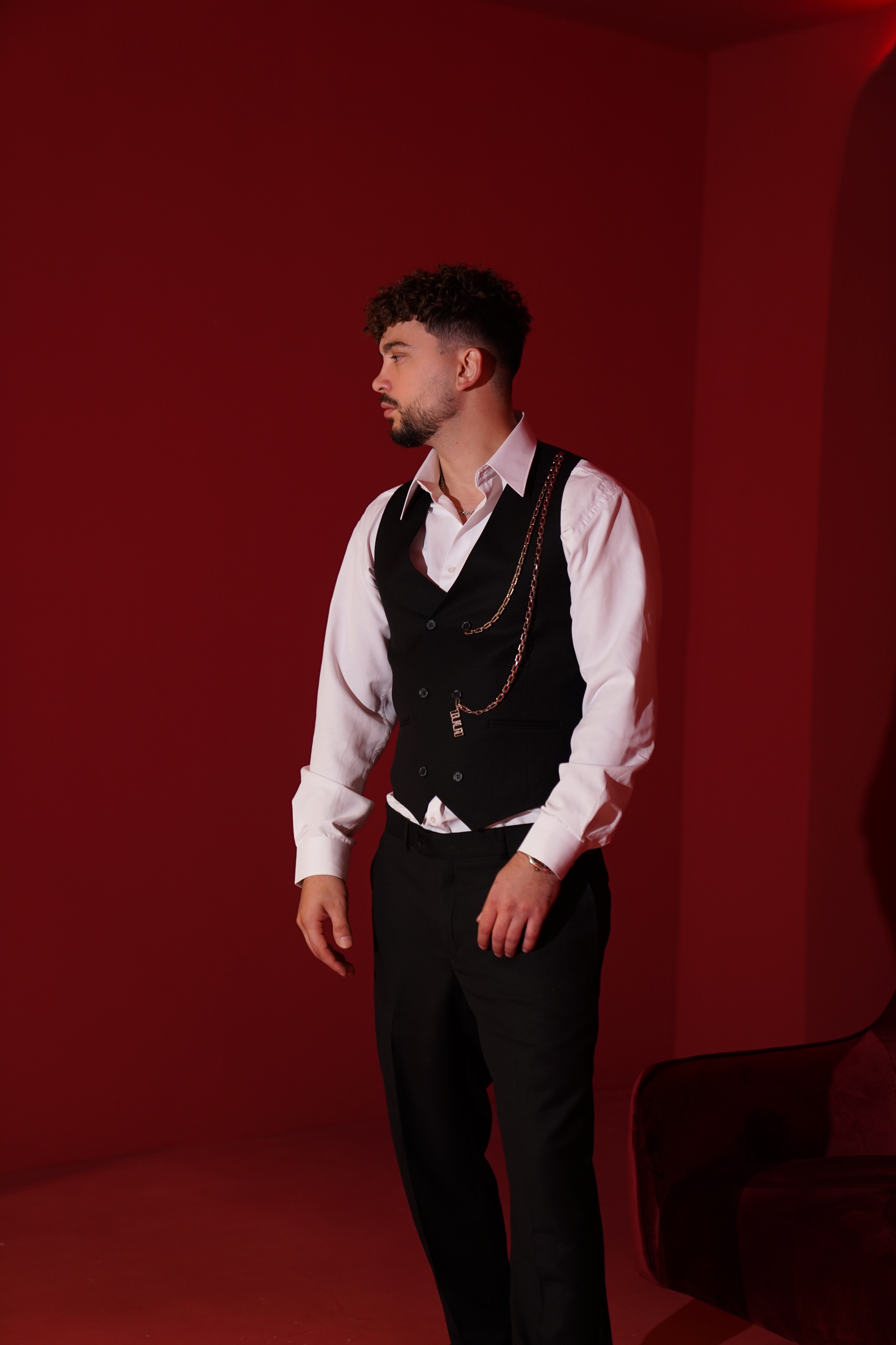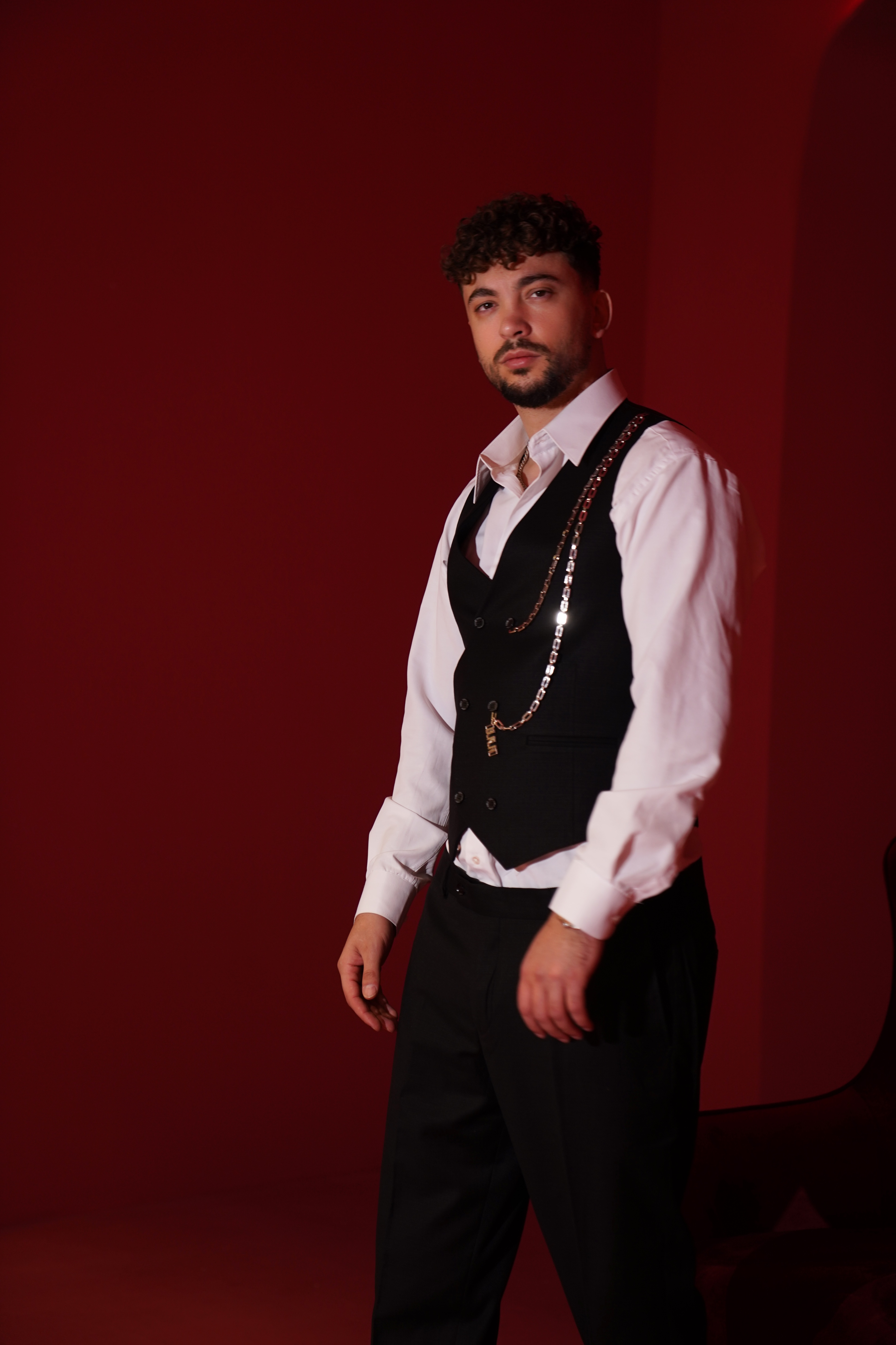 Jelek: Ngjyrë e zezë, me prerje 'slim-fit' që përshtatet pas trupit. Karakteristika kryesore është zinxhiri delikat i argjendtë. Këmishë: E bardhë, e punuar nga pambuk cilësor me një shkëlqim delikat. Pantallonat: Ngjyrë e zezë, punuar me material të lehtë dhe komod.