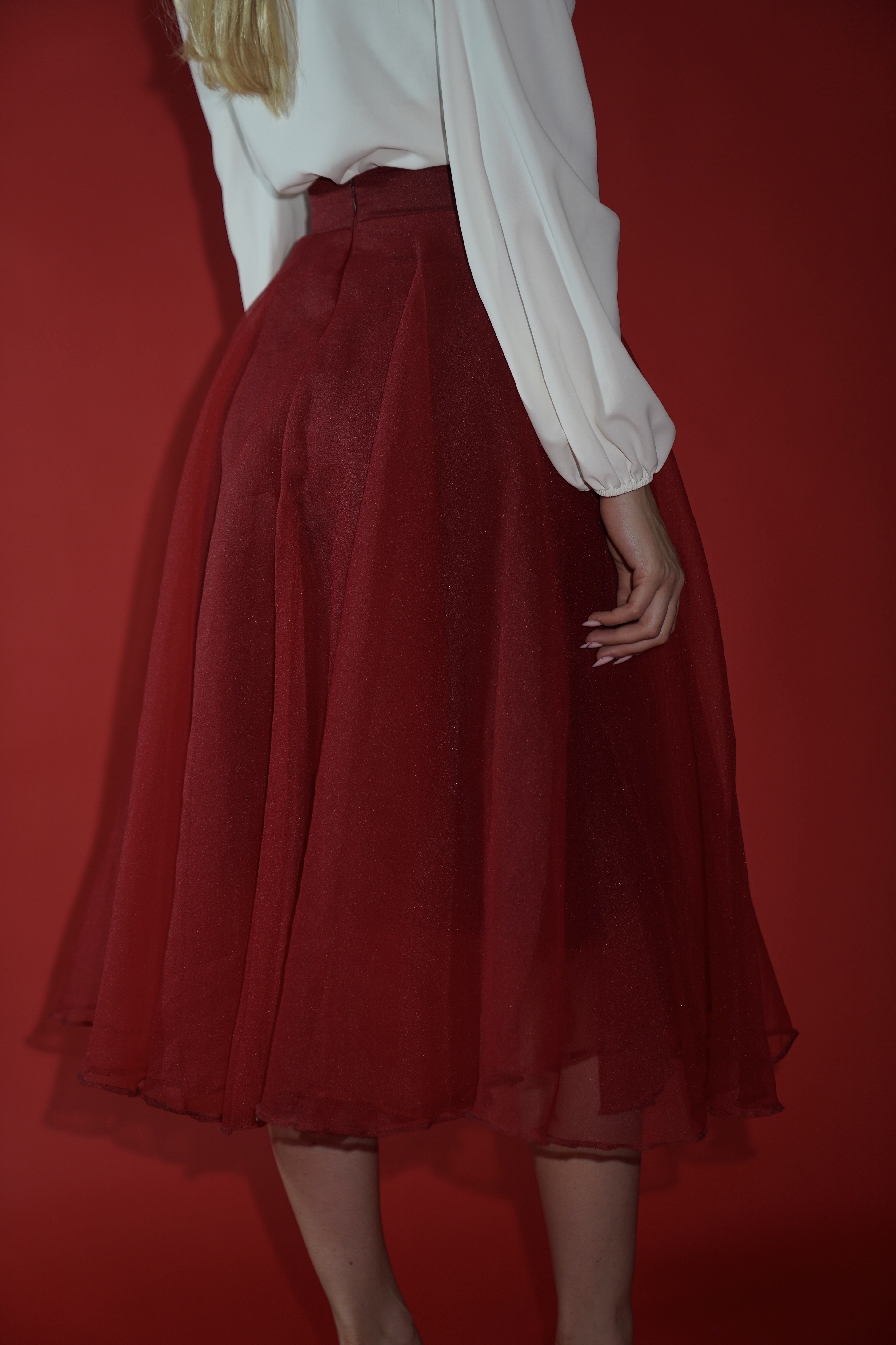Fund One Size i gjatë në ngjyrë të kuqe, me prerje të gjerë dhe vëlliminoze, që krijon lëvizje të lehtë dhe femërore në çdo hap. Në bel ka një rrip elastik, që i jep kontrast modern dhe e bën më të përshtatshëm për kombinime urbane apo elegante.