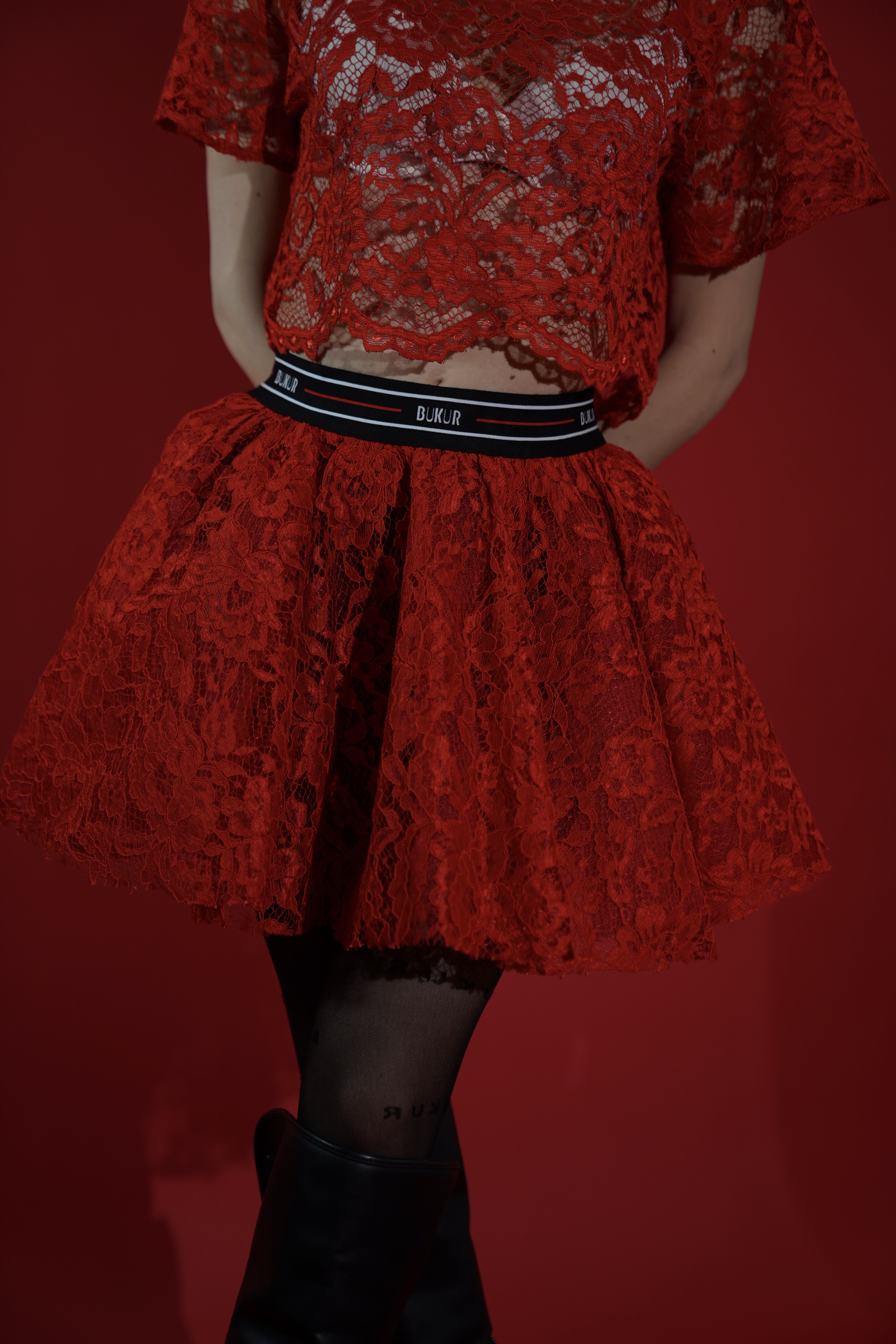 Fund në ngjyrë të kuqe të ndezur, sjell një pamje femërore, romantike dhe shumë tërheqëse. Materiali prej dantelle së pasur krijon volum të butë, ndërsa beli elastik me logon Bukur shton një prekje moderne dhe sportive. Perfekt për kombinime festive, mbrëmje apo raste ku dëshiron të dallohesh me stil dhe energji
