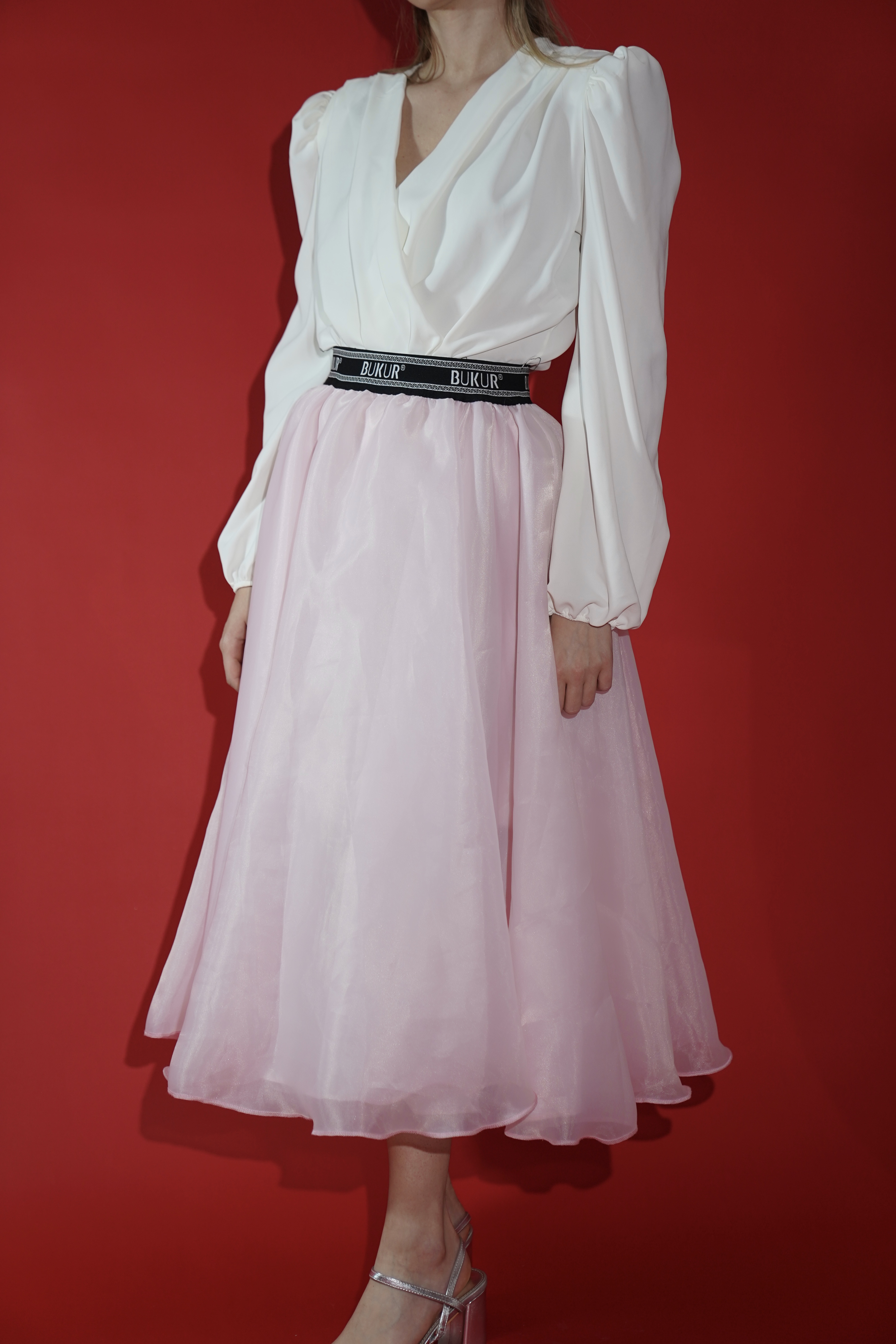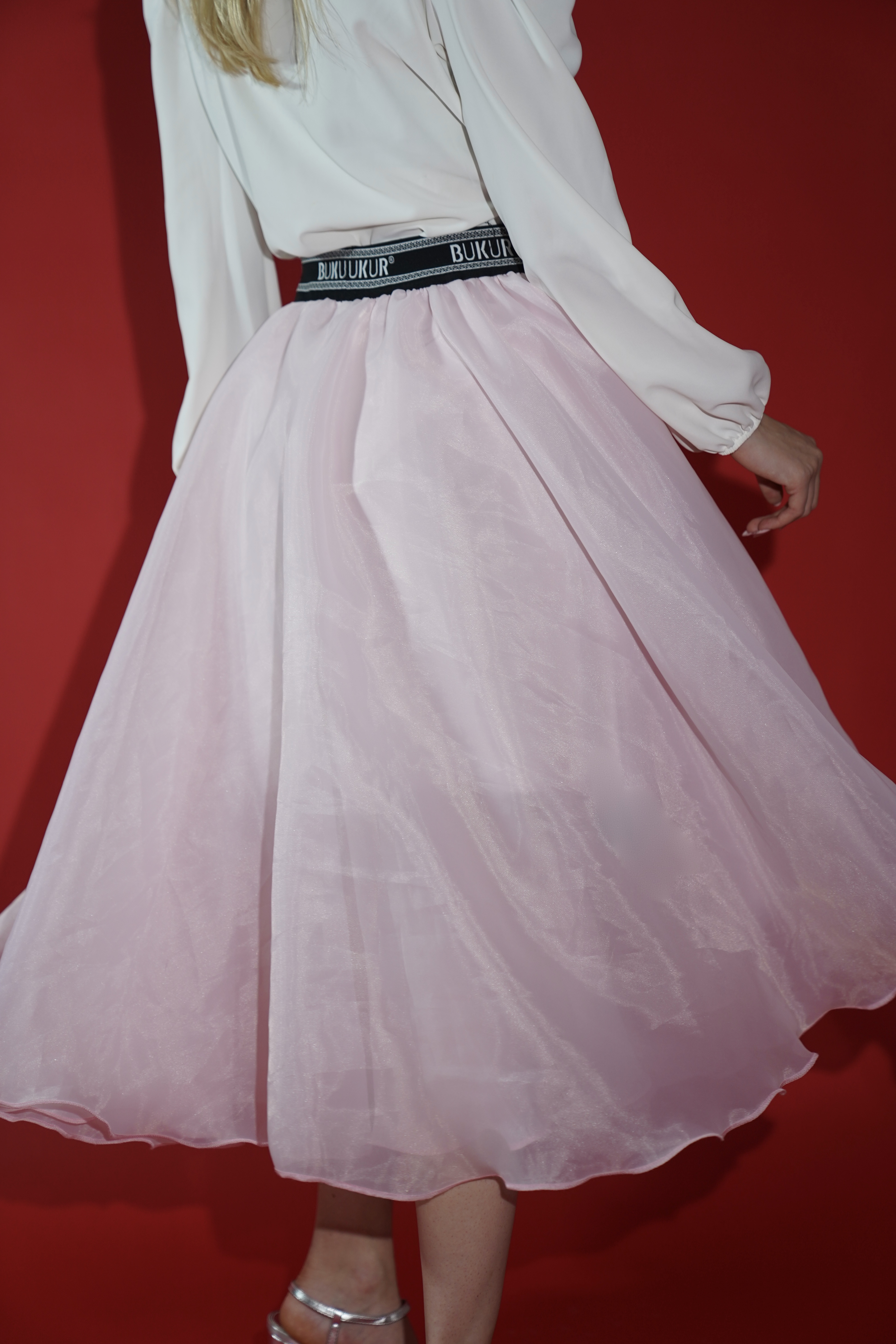 Fund One Size i gjatë në ngjyrë pink të butë, me prerje të gjerë dhe vëlliminoze, që krijon lëvizje të lehtë dhe femërore në çdo hap. Në bel ka një rrip elastik me logon “BUKUR”, që i jep kontrast modern dhe e bën më të përshtatshëm për kombinime urbane apo elegante.