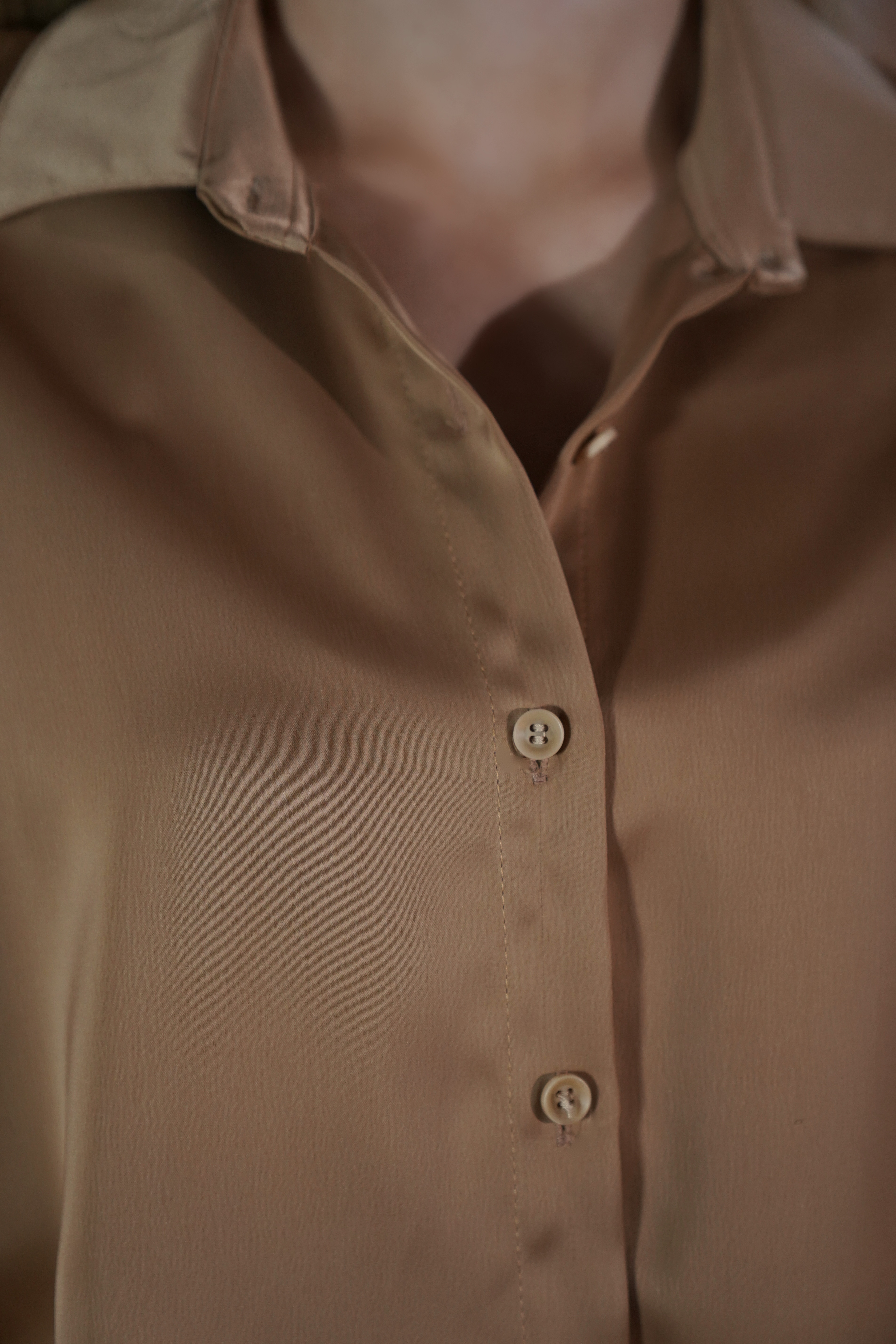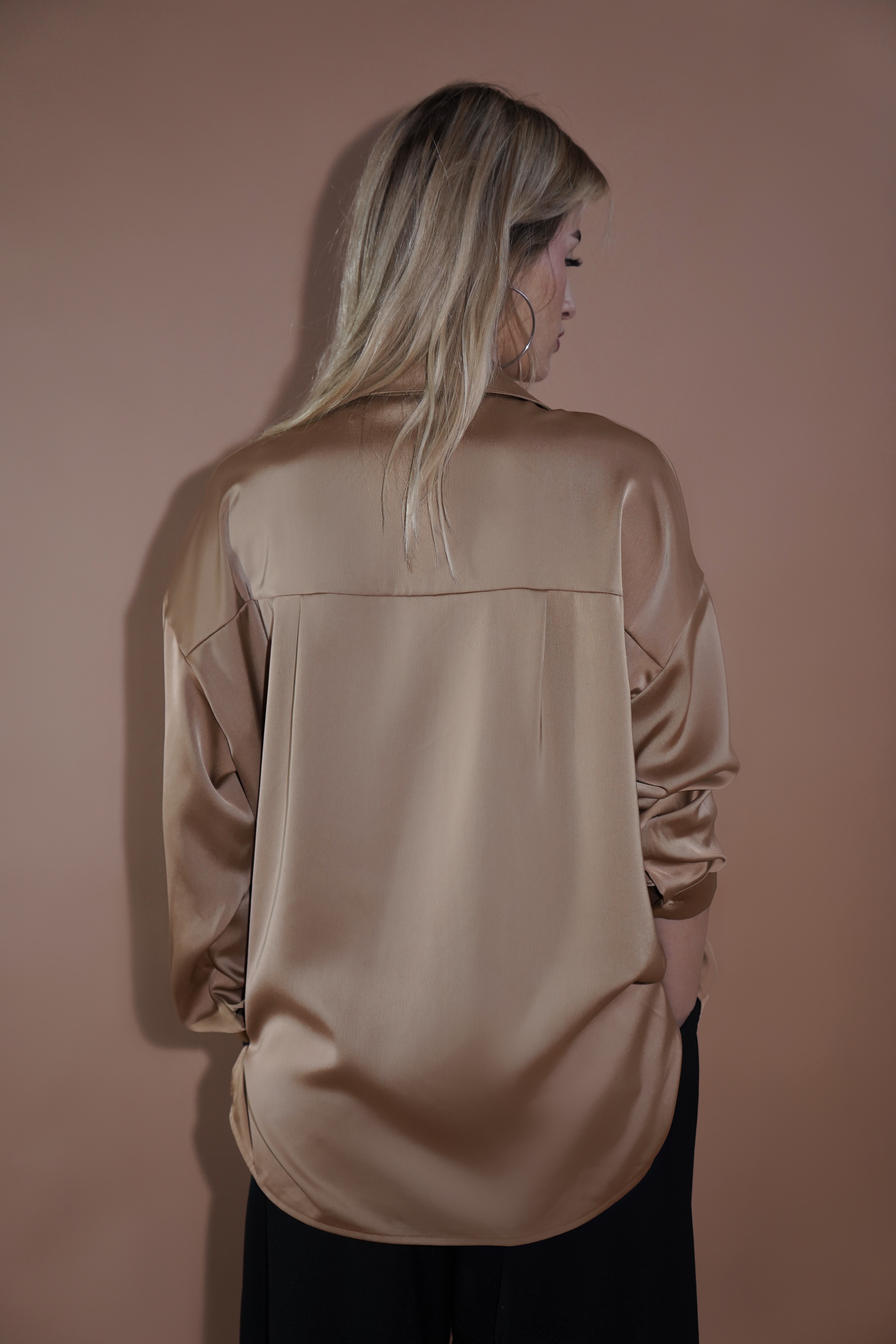 Këmishë sateni në ngjyrë kafe të artë, me shkëlqim delikat dhe teksturë të butë që sjell elegancë dhe rehati në çdo veshje. Me prerje të lirshme, mëngë të gjata dhe jakë klasike, është zgjedhja ideale si për ditë pune, ashtu edhe për mbrëmje.