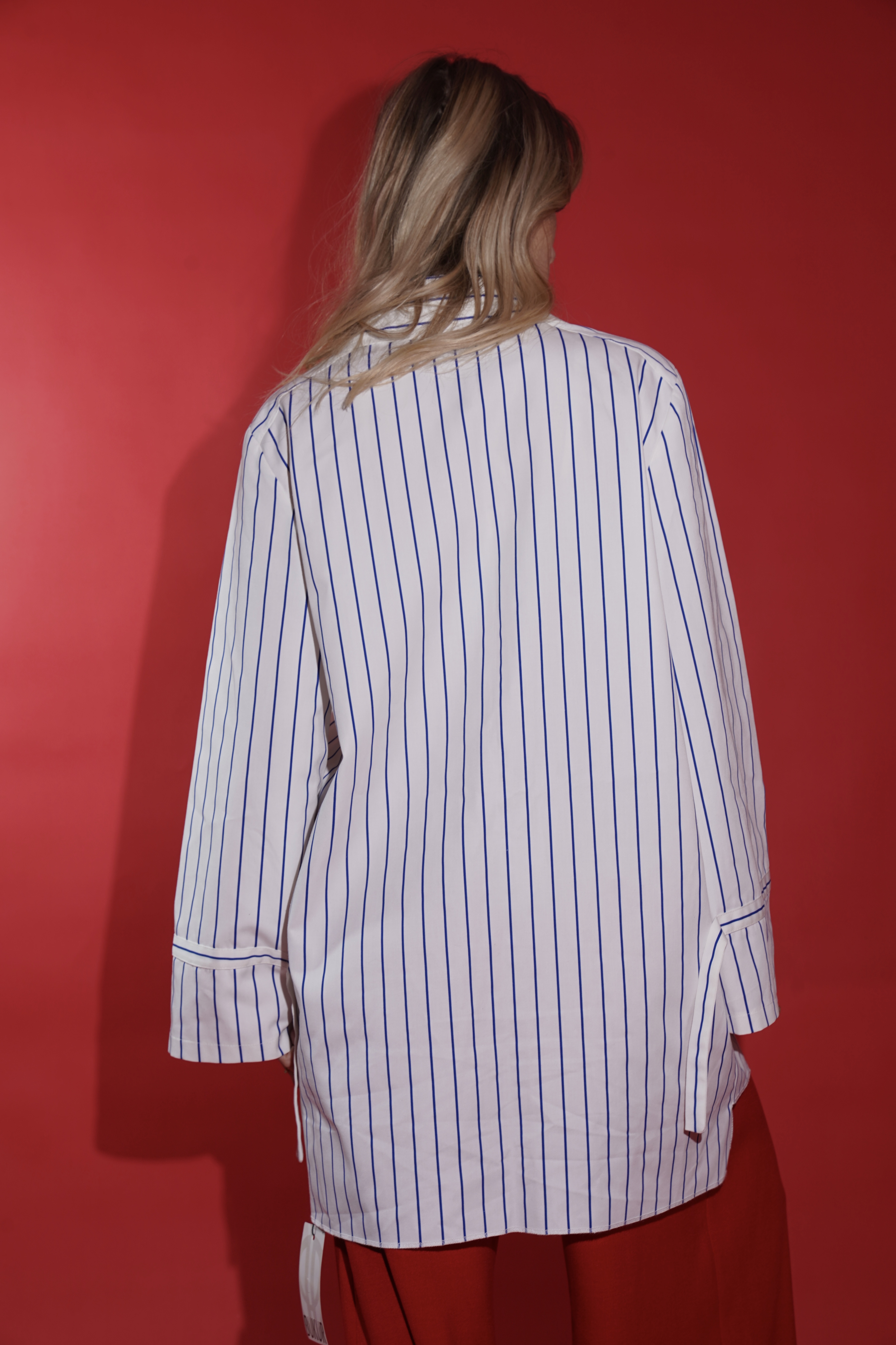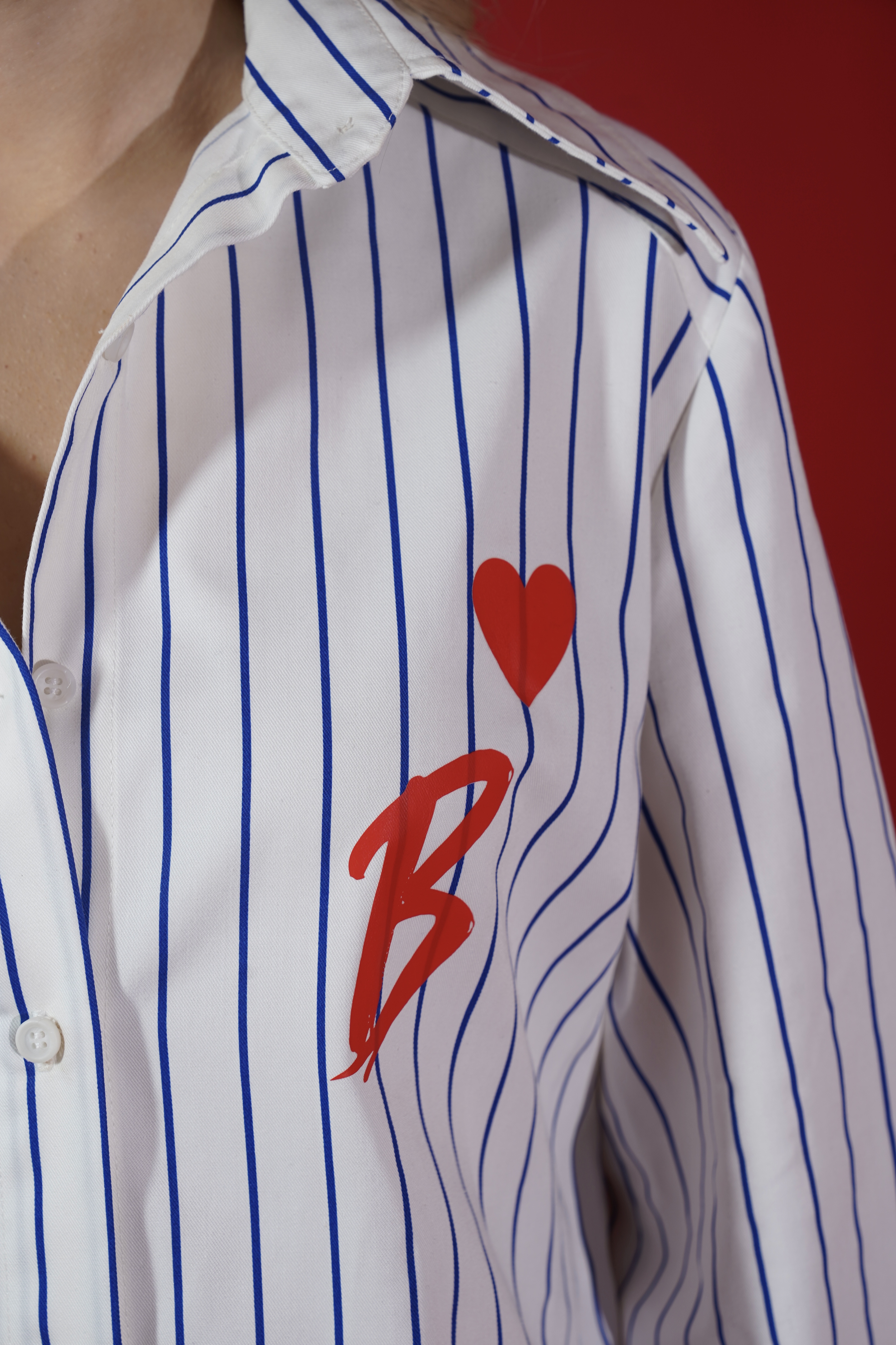 Rinore, e freskët dhe plot stil. Këmishë me vija vertikale në ngjyrë blu dhe detaj zemre me inicialin B, që i jep karakter unik pamjes. Prerje e lirshme dhe dizajn one size, për rehati dhe elegancë në çdo kombinim.