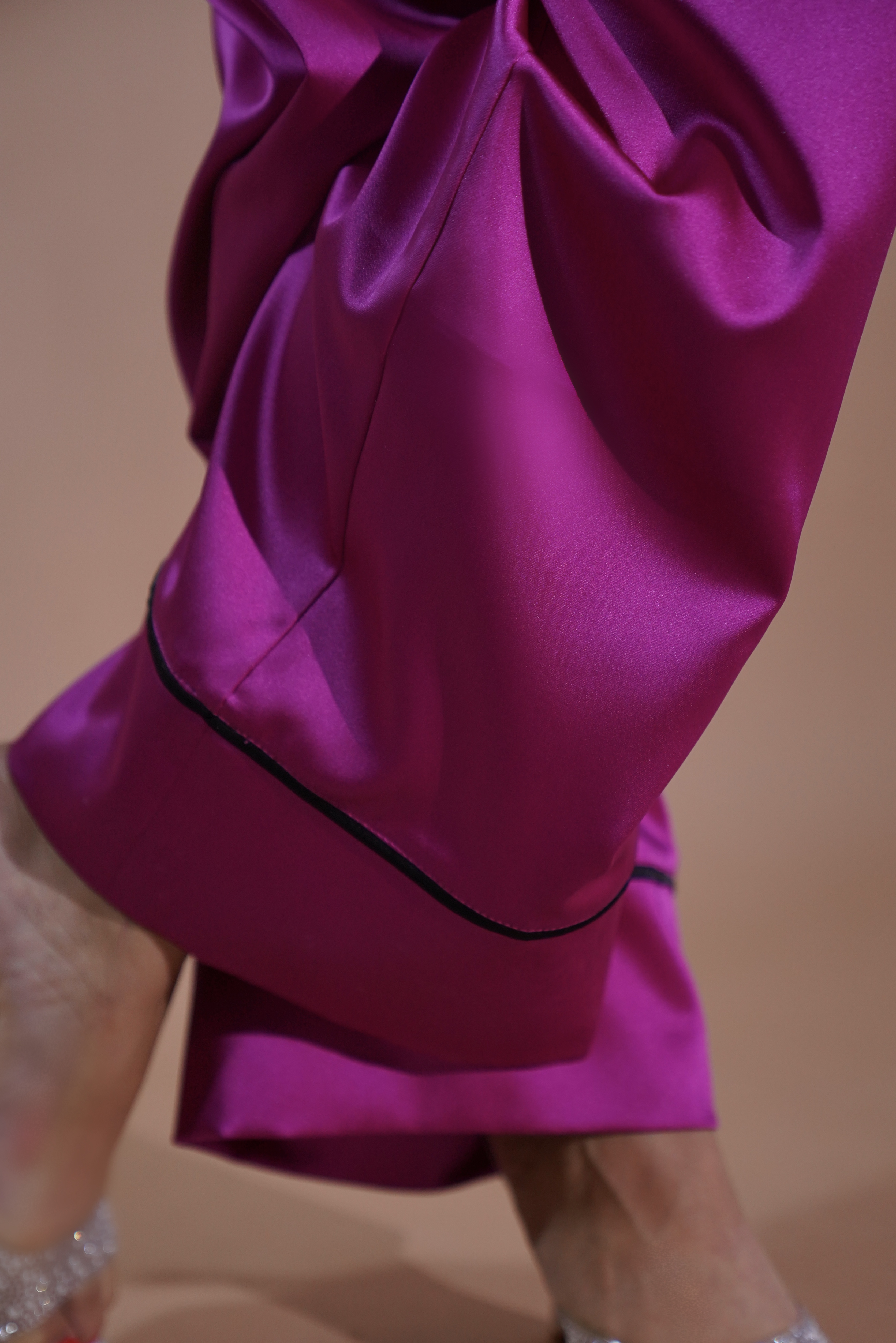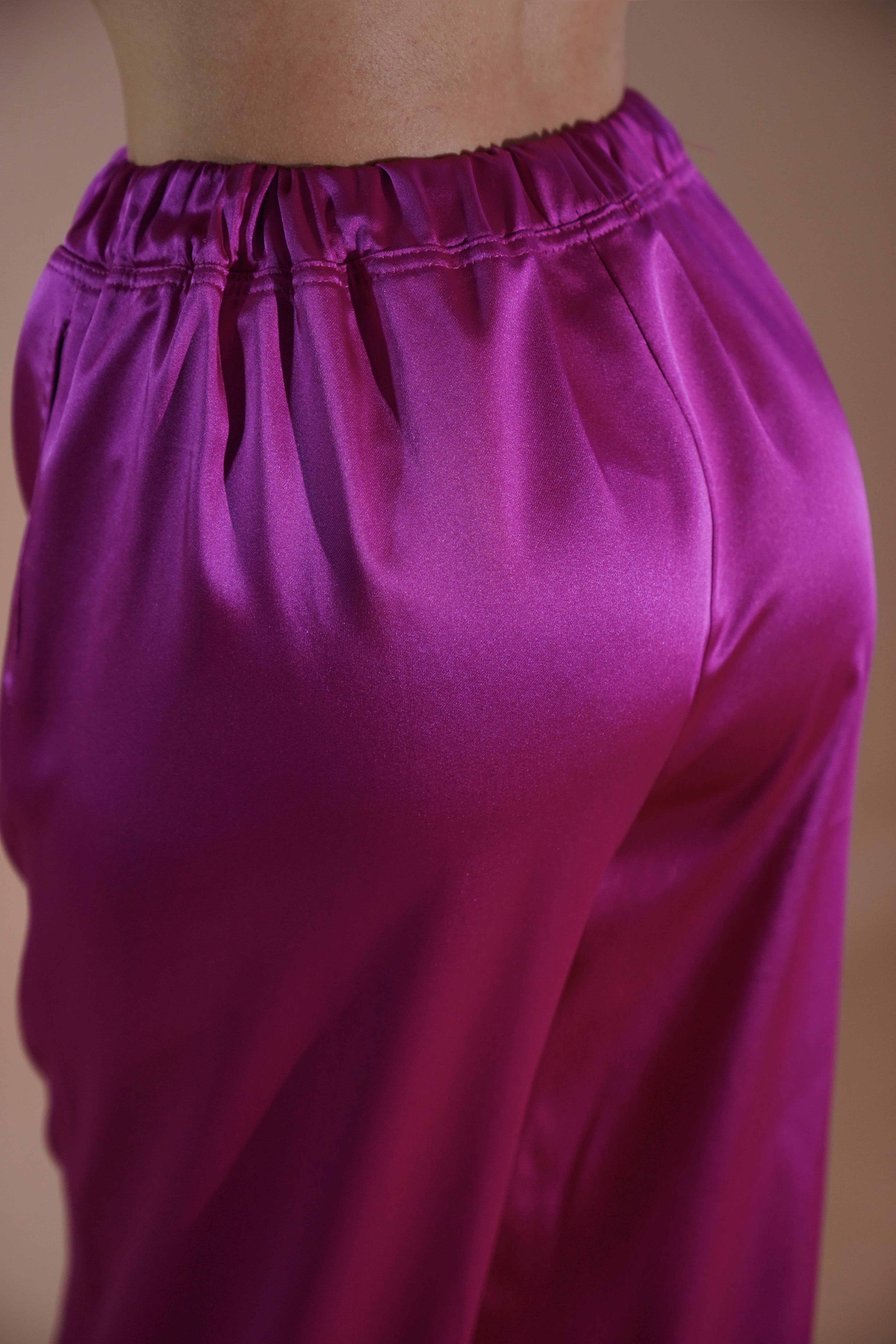 Pantallona elegante sateni në ngjyrë rozë të ndezur, që kombinojnë energjinë dhe feminitetin në një veshje të vetme. Me prerje të gjerë dhe bel elastik, ofrojnë rehati maksimale duke shtuar një prekje luksoze falë shkëlqimit delikat të materialit.