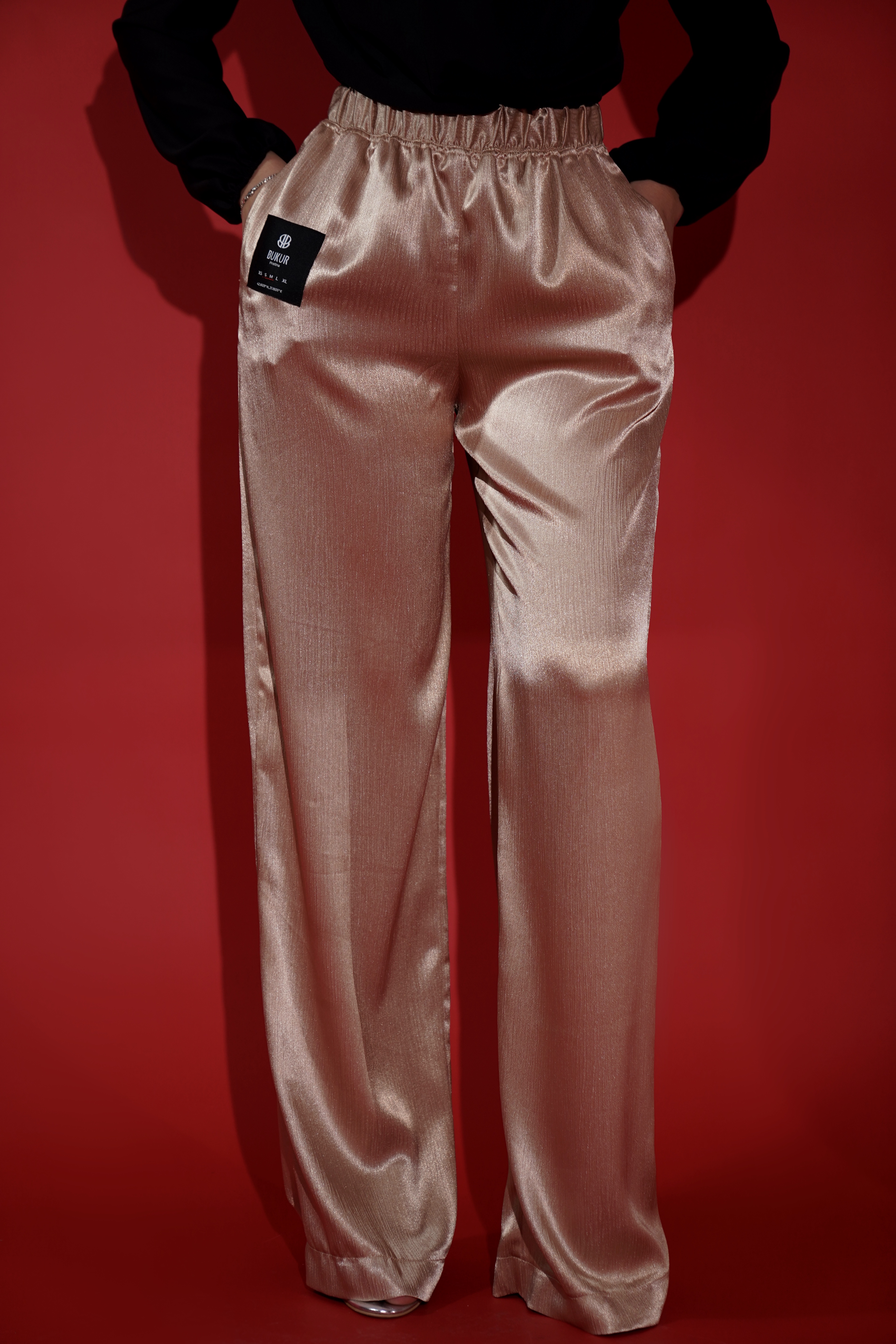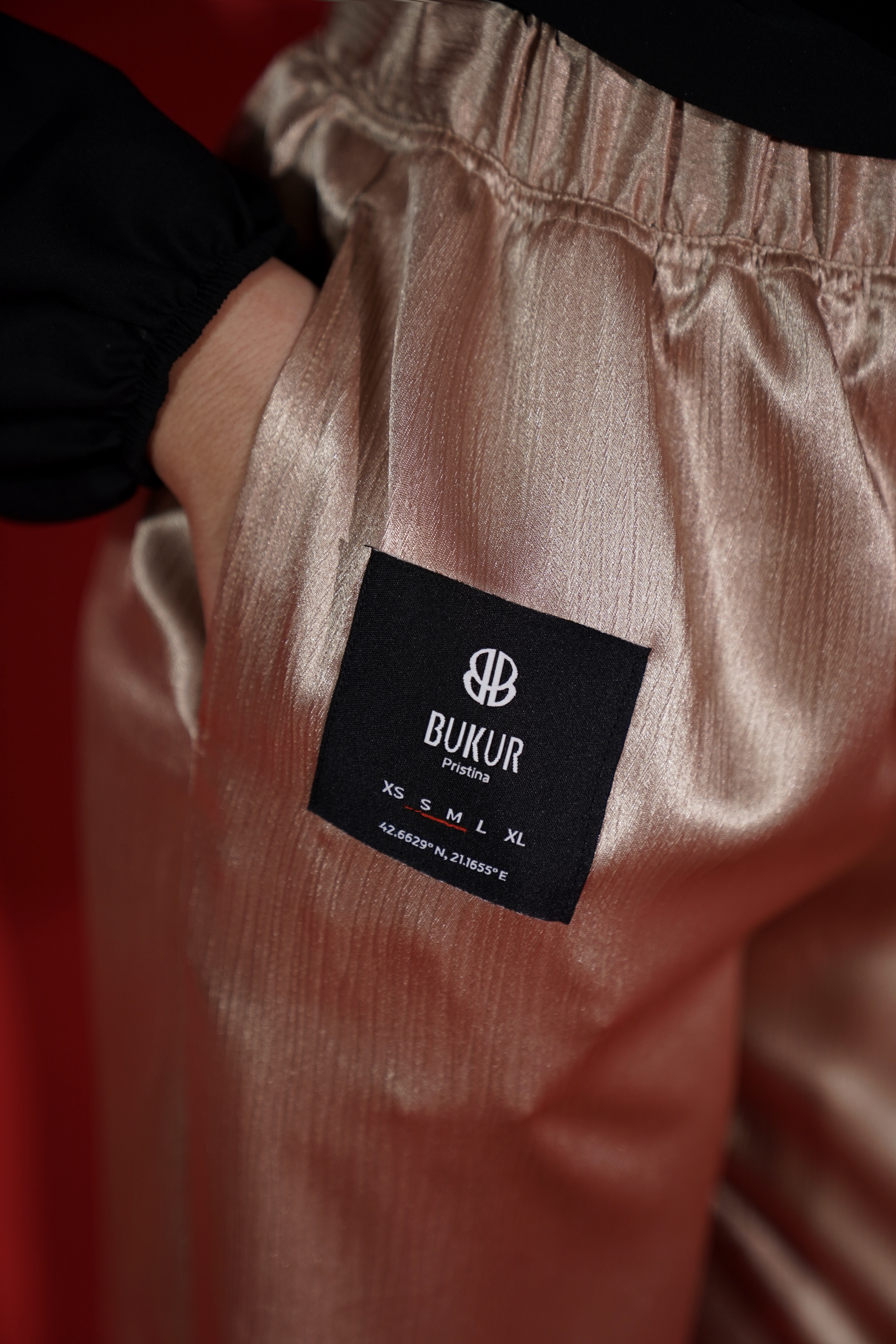 Pantallona saten në ngjyrë klafe e hapur, me shkëlqim elegant dhe pamje luksoze. Kanë një prerje të drejtë dhe të lirshme, që ofron rehati dhe elegancë njëkohësisht. Beli elastik siguron përshtatje të lehtë dhe komoditet gjatë veshjes, ndërsa xhepat anësorë shtojnë funksionalitet dhe stil modern.