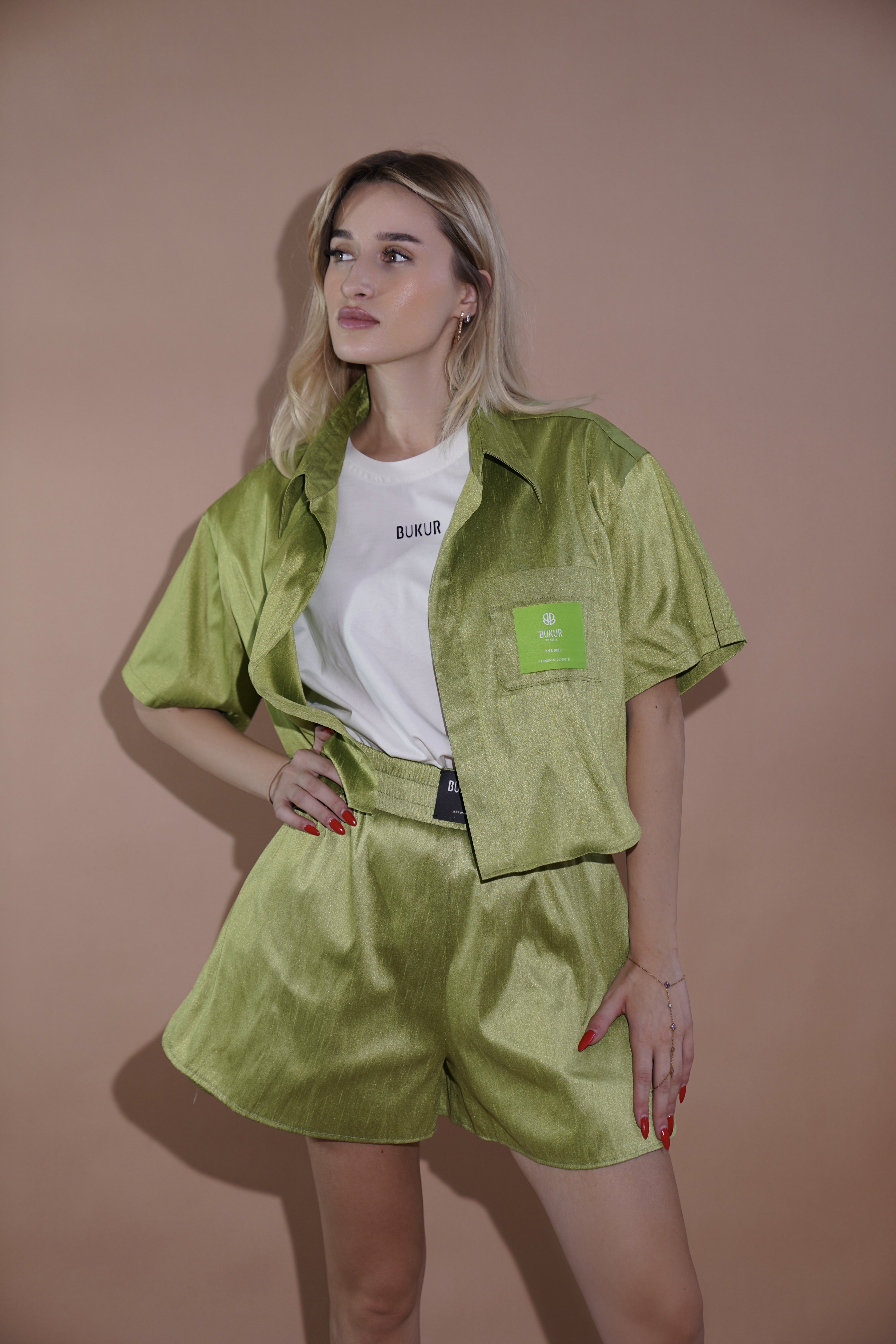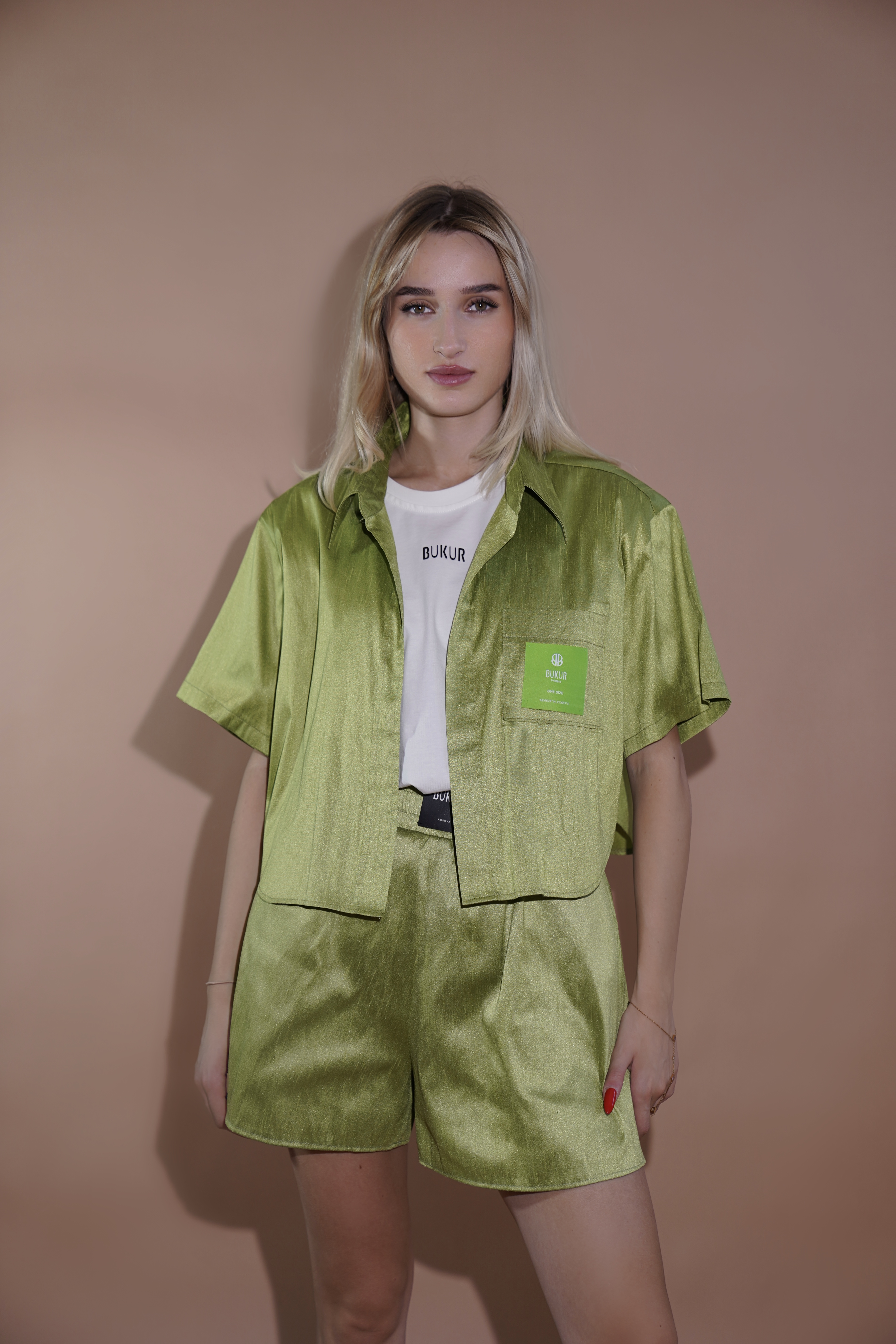 Set veror në ngjyrë jeshile metalike, që sjell freski dhe stil unik. Pjesa e sipërme me mëngë të shkurtra, xhep funksional dhe detaje BUKUR, kombinohet në mënyrë perfekte me pantallonat e shkurtra me bel të lartë. Një zgjedhje moderne për ditët e ngrohta dhe daljet urbane.