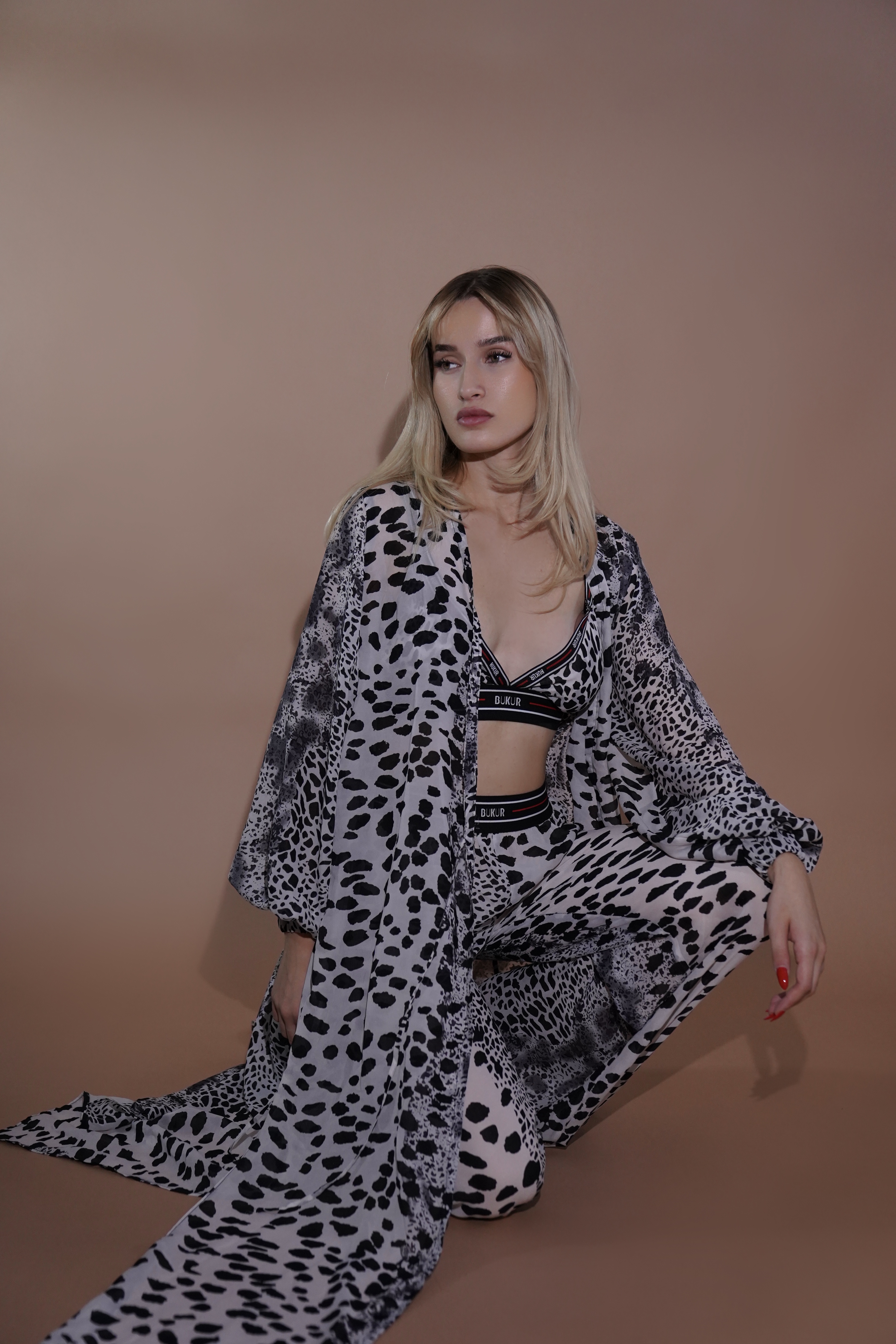 Set treshe femëror dhe modern, i përbërë nga top crop, pantallona të gjata dhe mantël i gjatë, me print animalier në kontrast bardhë e zi. Ky kombinim unik bashkon sensualitetin me elegancën.