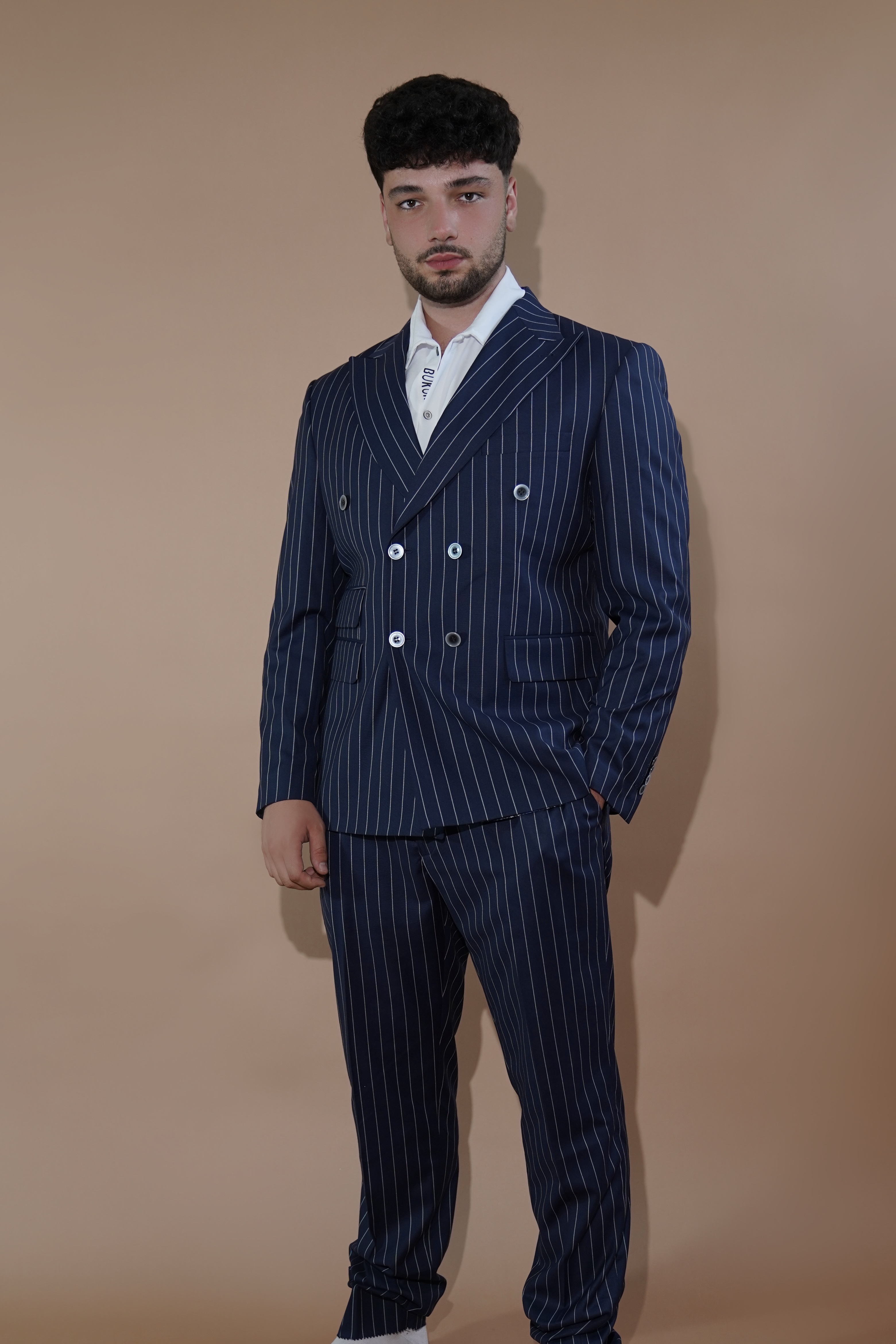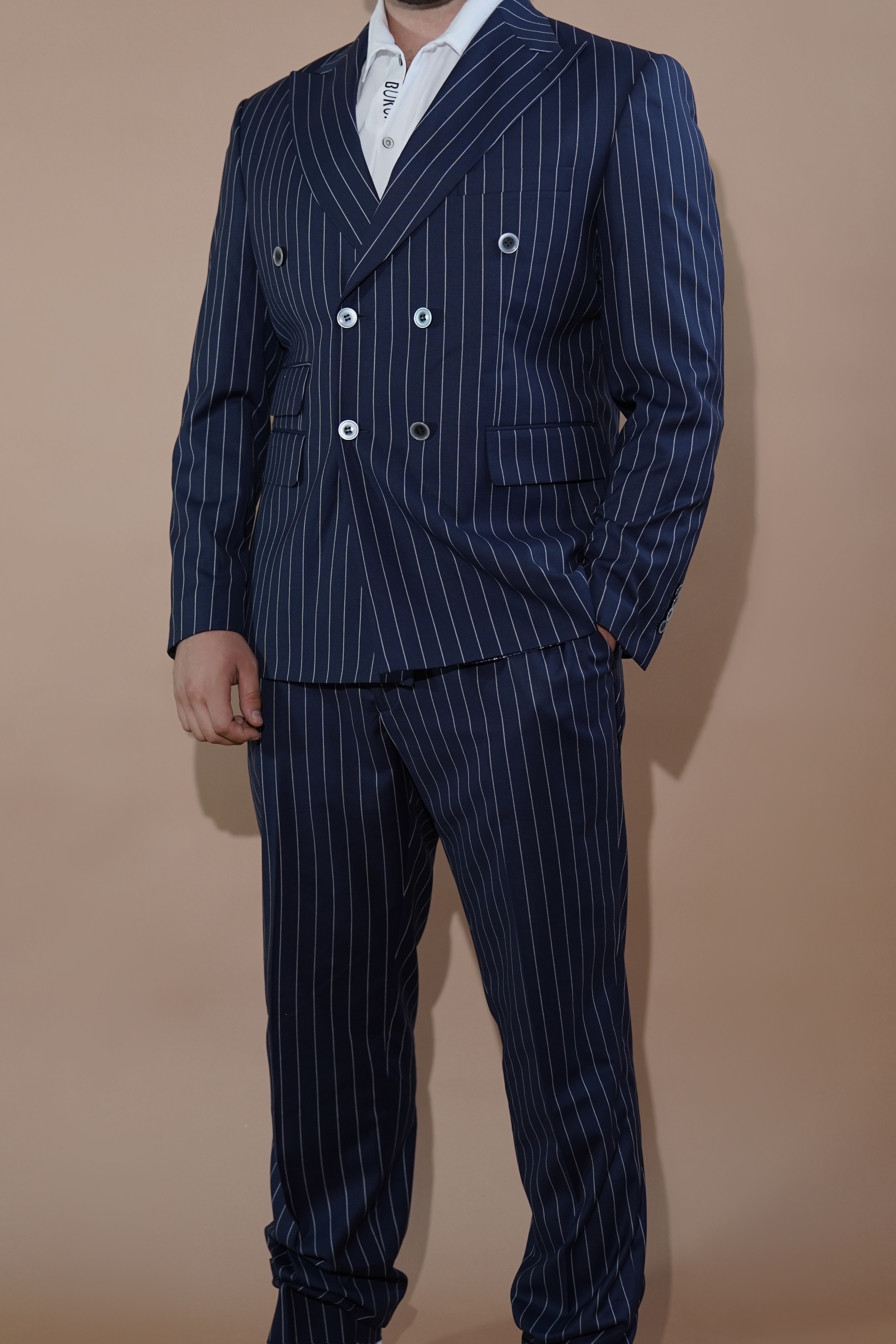Kostum elegant ngjyrë blu e errët me vija të holla vertikale, një zgjedhje klasike që kombinon stilin formal me sofistikimin modern. Xhaketa me dy rreshta kopsash dhe xhepa funksionalë e bën këtë set të përshtatshëm si për biznes, ashtu edhe për evente speciale.