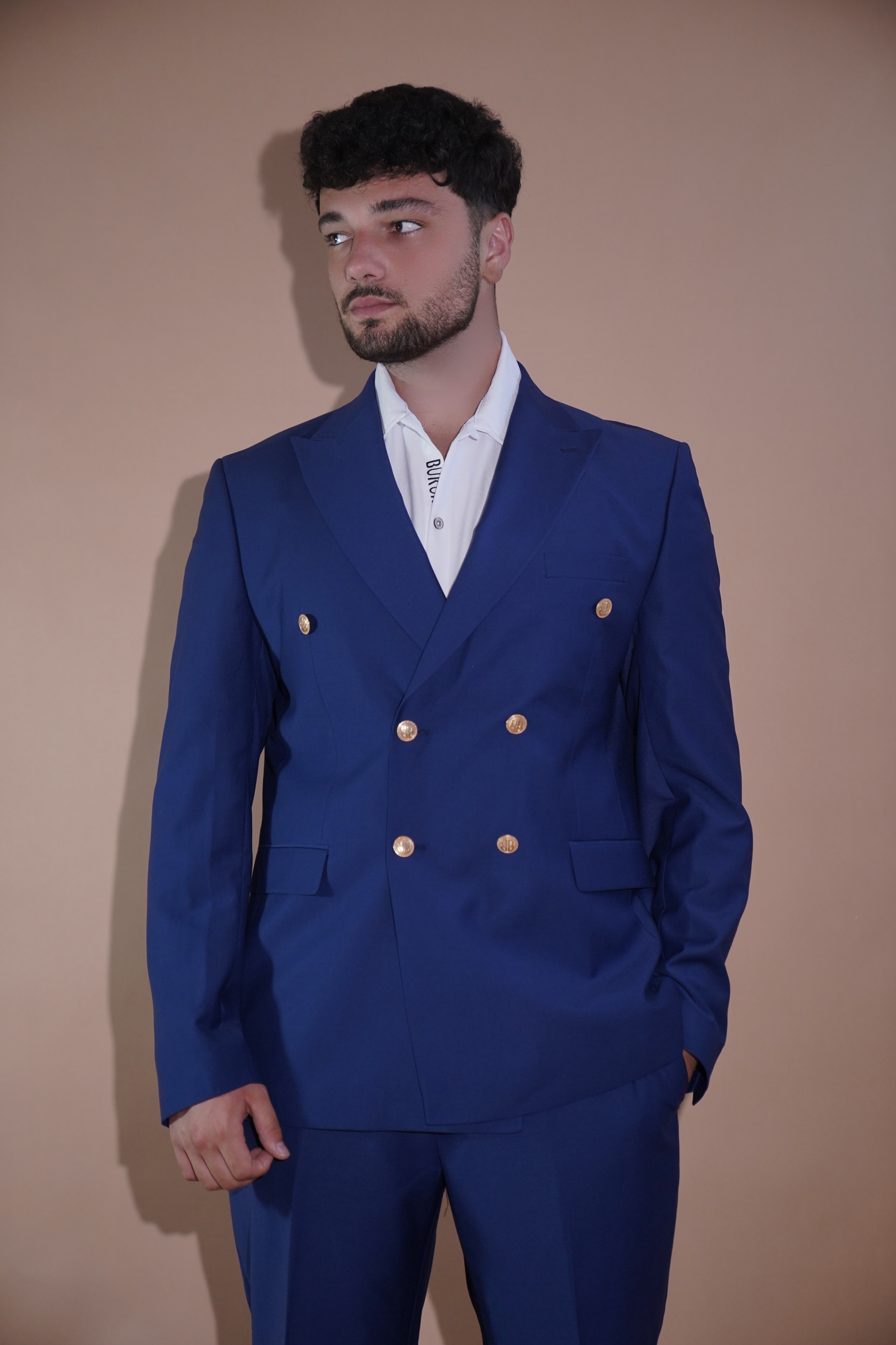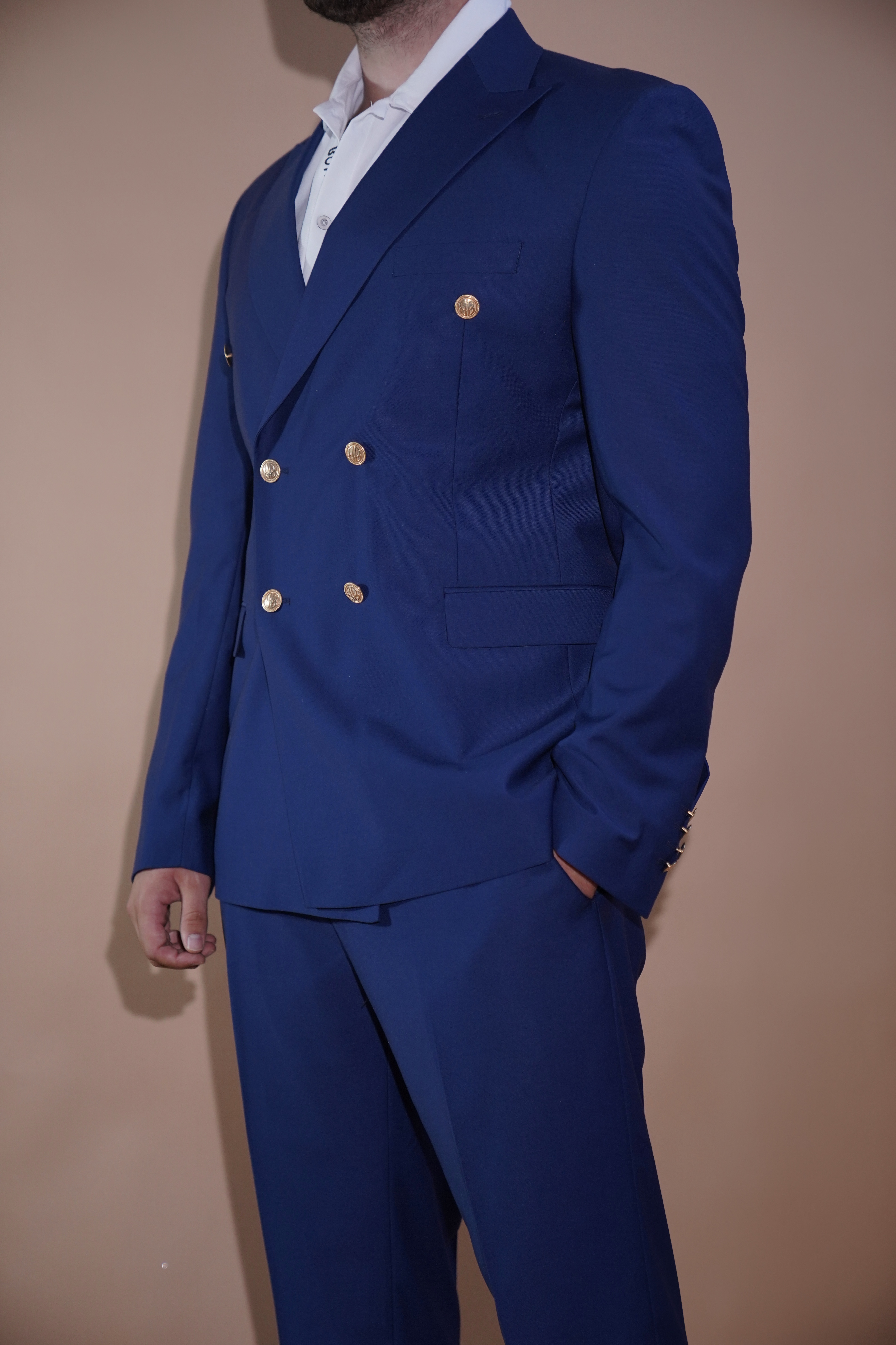 Kostum elegant ngjyrë blu mbretëror, me dizajn modern dhe prerje klasike që reflekton stil dhe siguri. Xhaketa me dy rreshta kopsash të artë shton finesë dhe hijeshi, ndërsa pantallonat e përshtatura krijojnë një pamje të pastër dhe të sofistikuar.