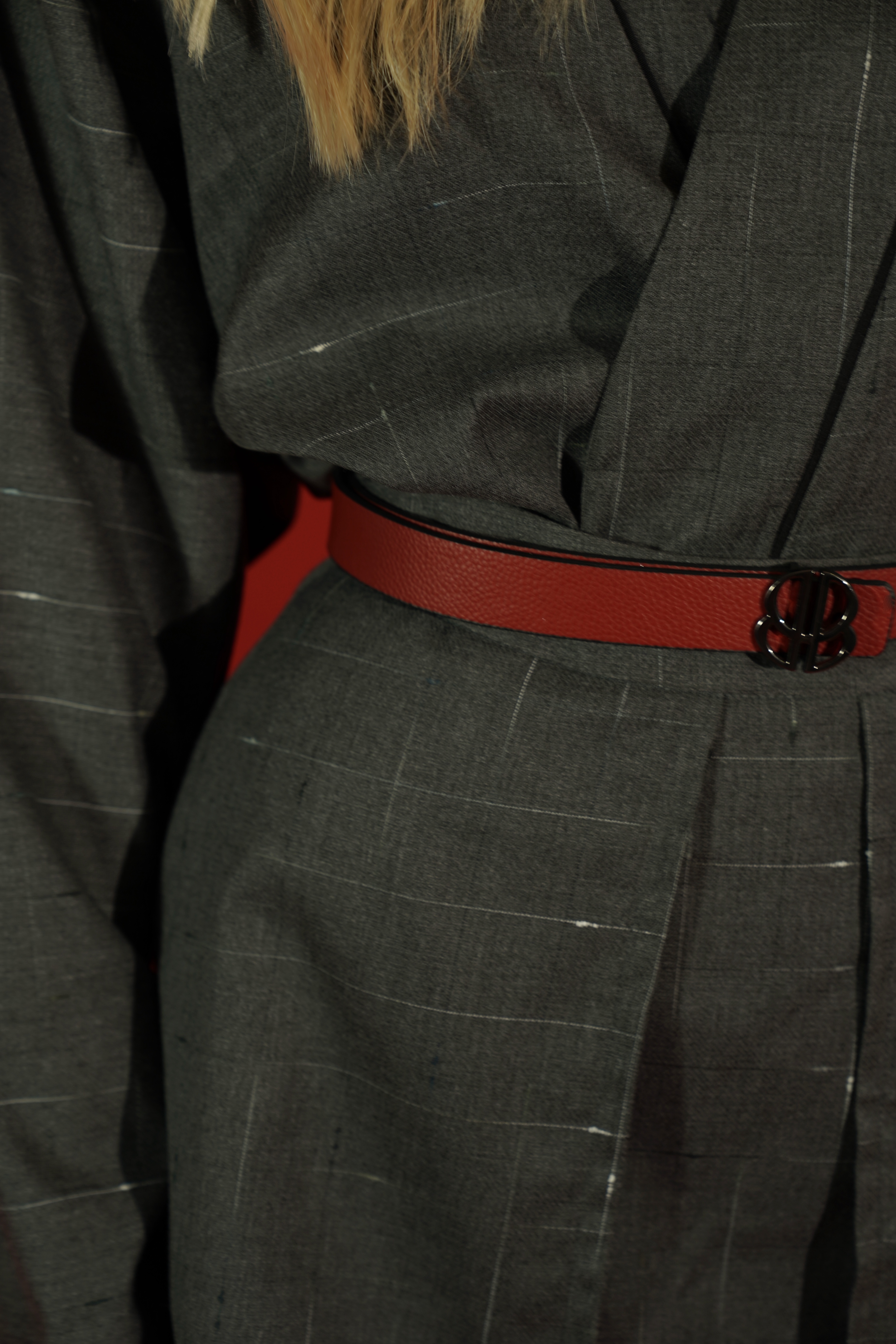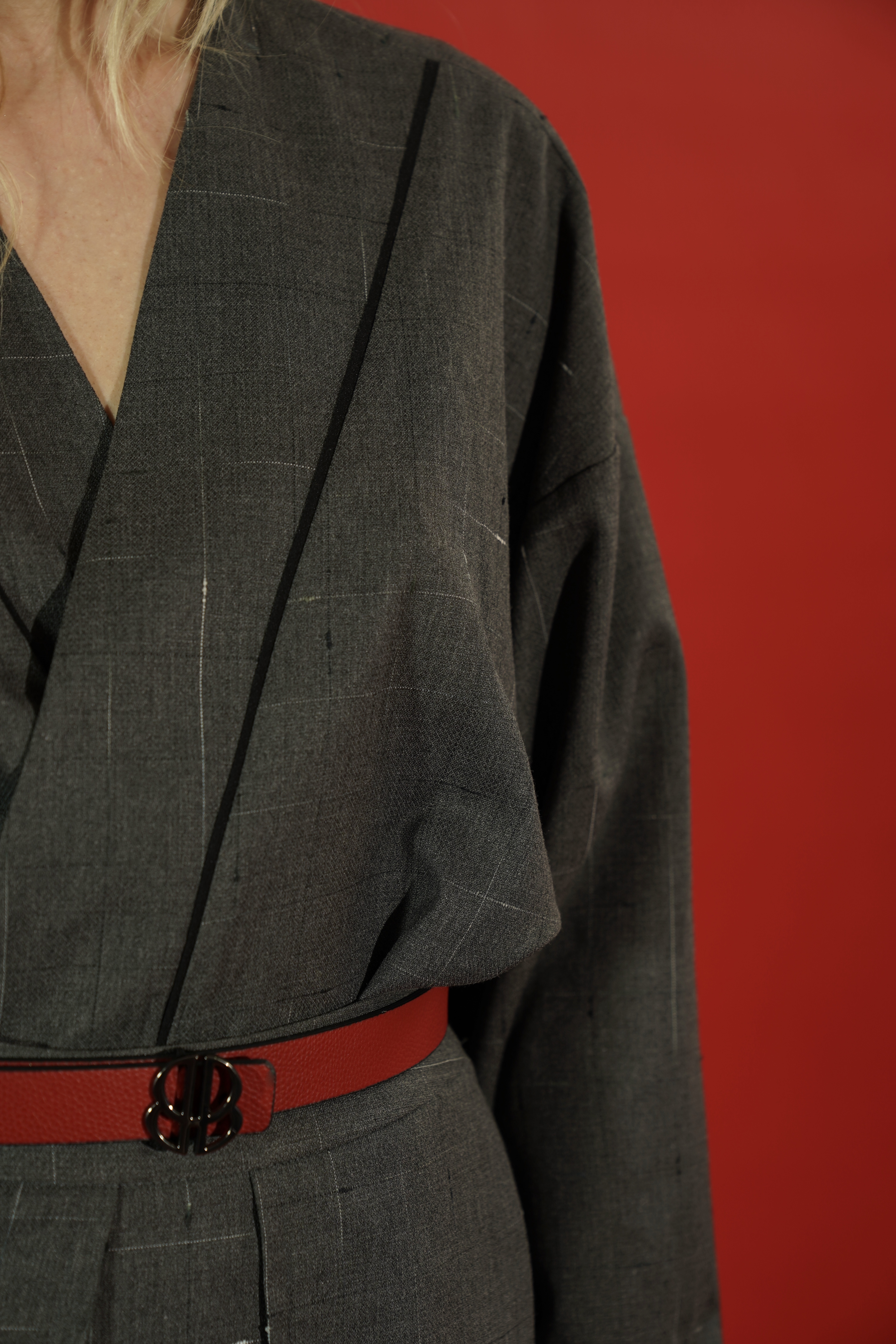 Setra One Size ka një dizajn të lirshëm me jakë të thjeshtë V, manga të gjata e të gjera, dhe theksohet në bel me një rrip të hollë të kuq që shton kontrast dhe finesë.