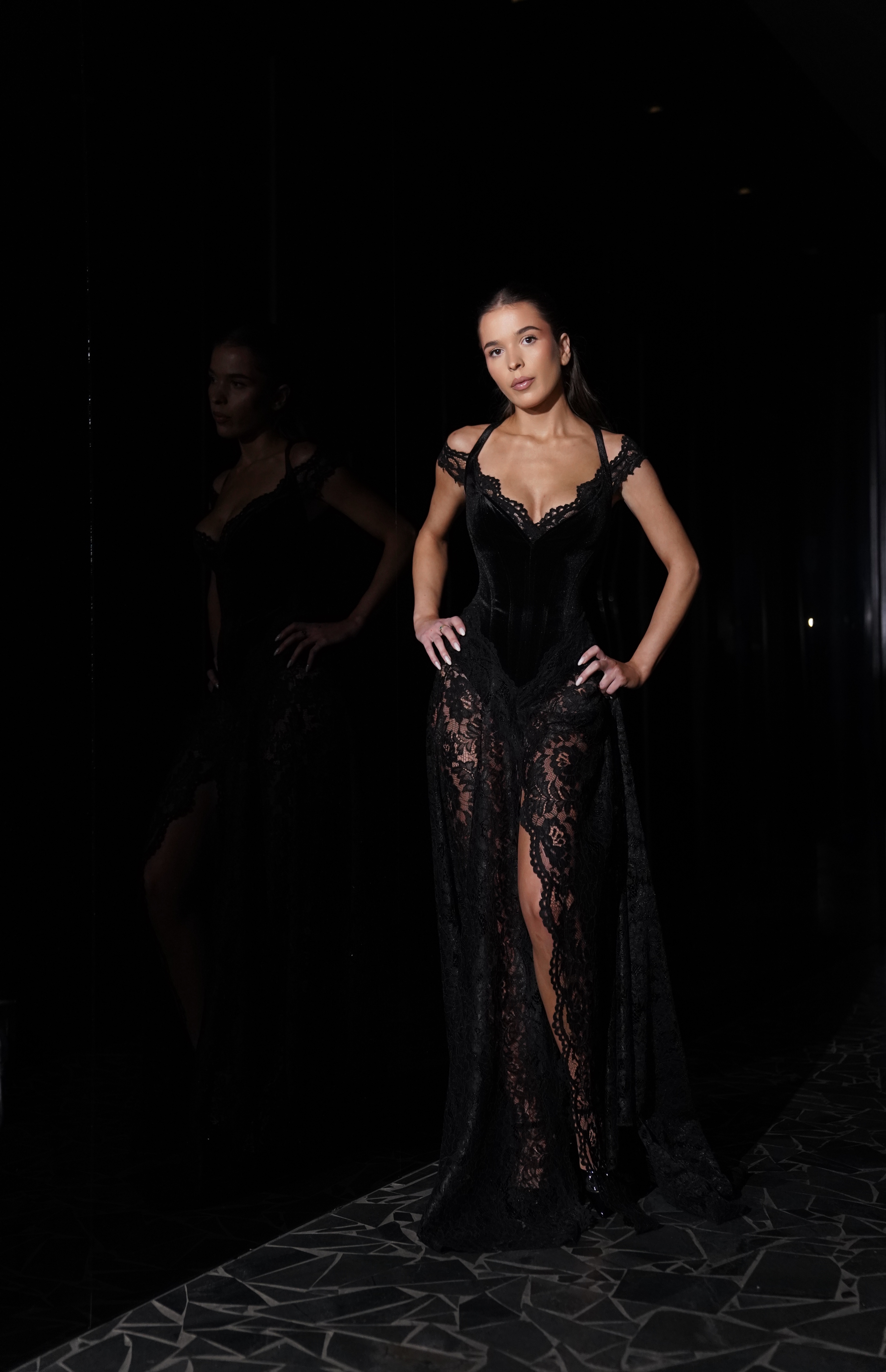 Fustan elegant dhe sensual, me një dizajn të sofistikuar në ngjyrë të zezë. Pjesa e sipërme ka prerje të strukturuar që përshtatet ngushtë me trupin.