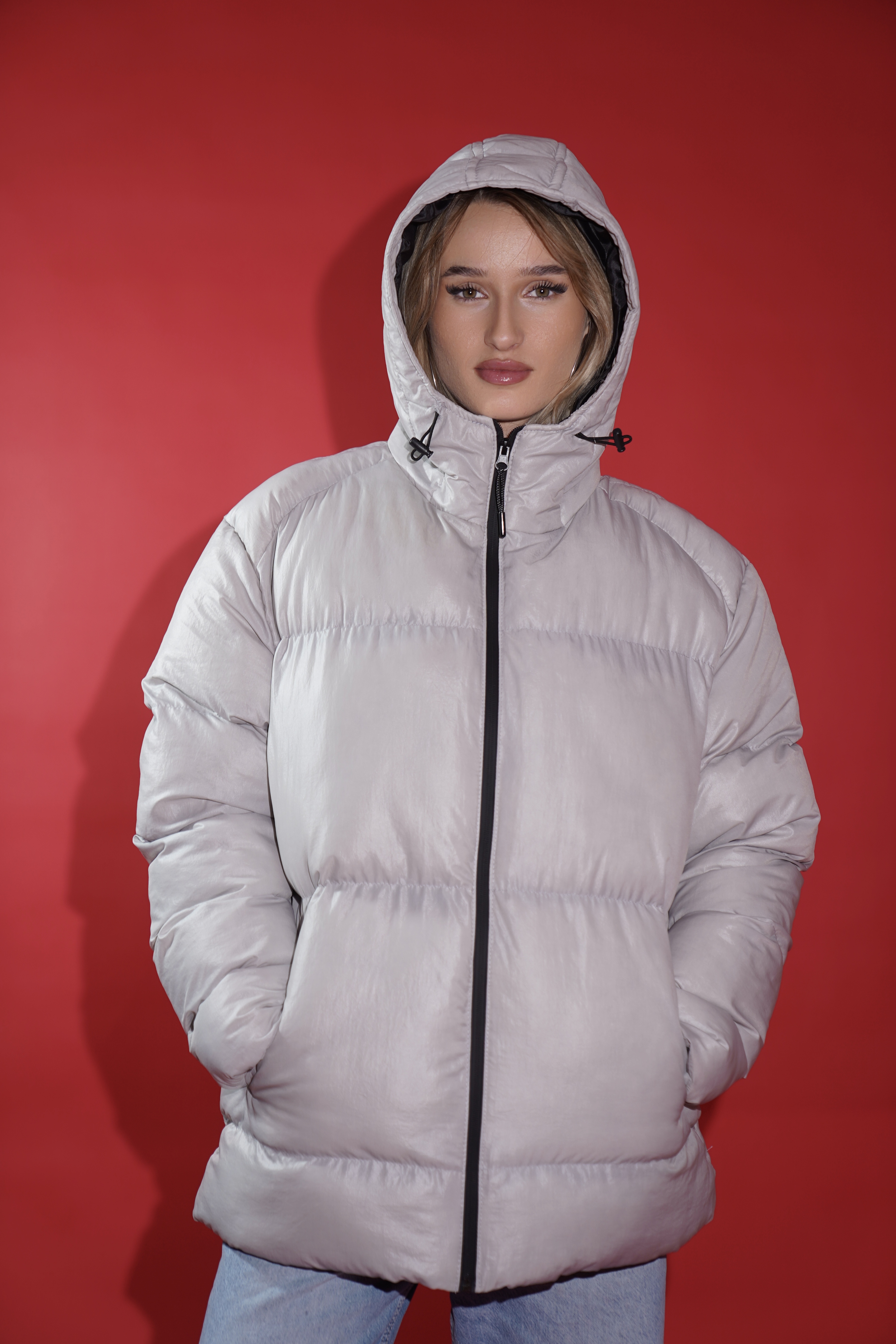 Ngrohtësi me stil. Xhaketë e fryrë one size në ngjyrë gri argjendtë, ideale për ditët e ftohta. Dizajni modern me kapuç dhe mbyllje me zinxhir ofron rehati dhe pamje elegante njëkohësisht. Kombinohet lehtë me çdo stil dimëror.