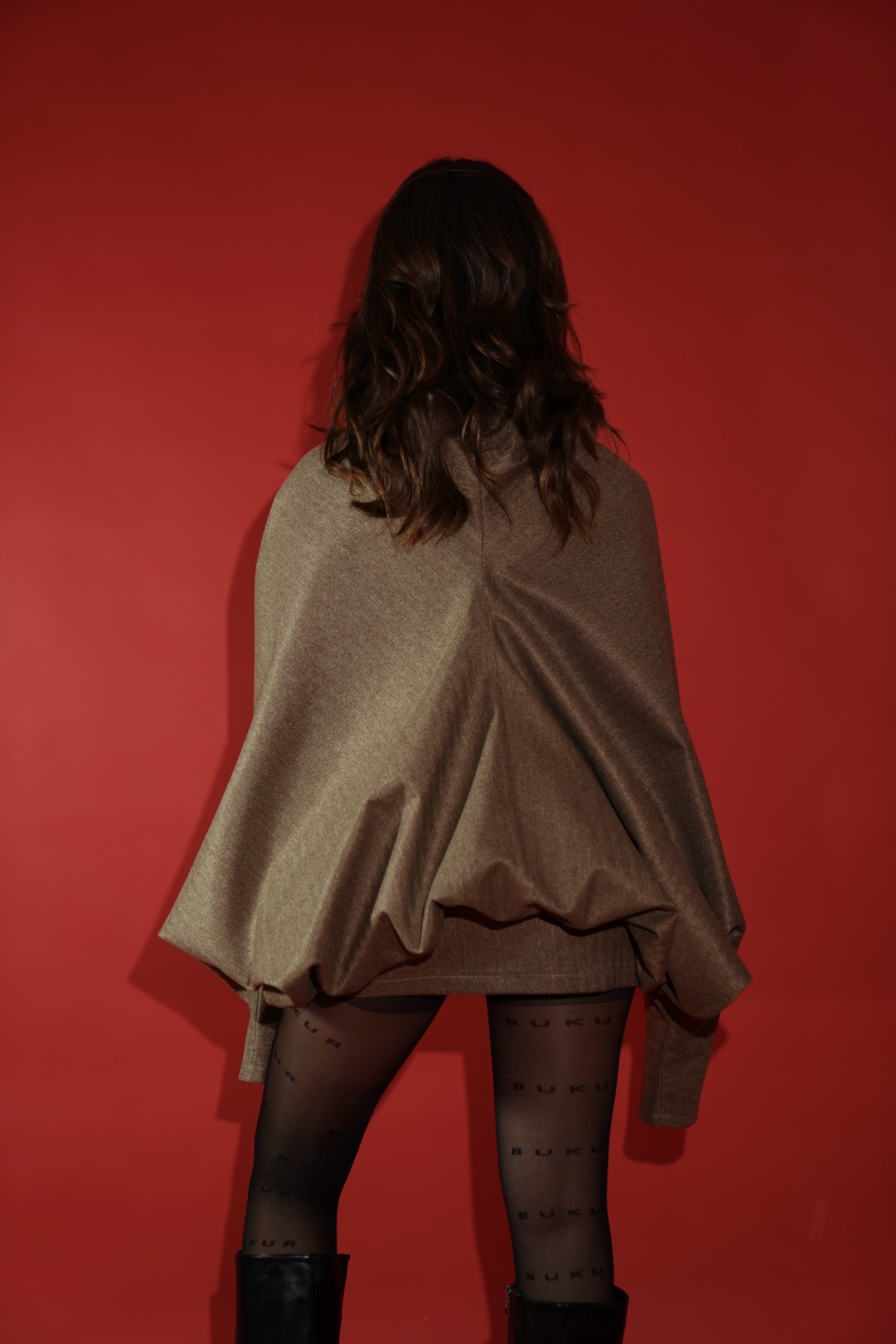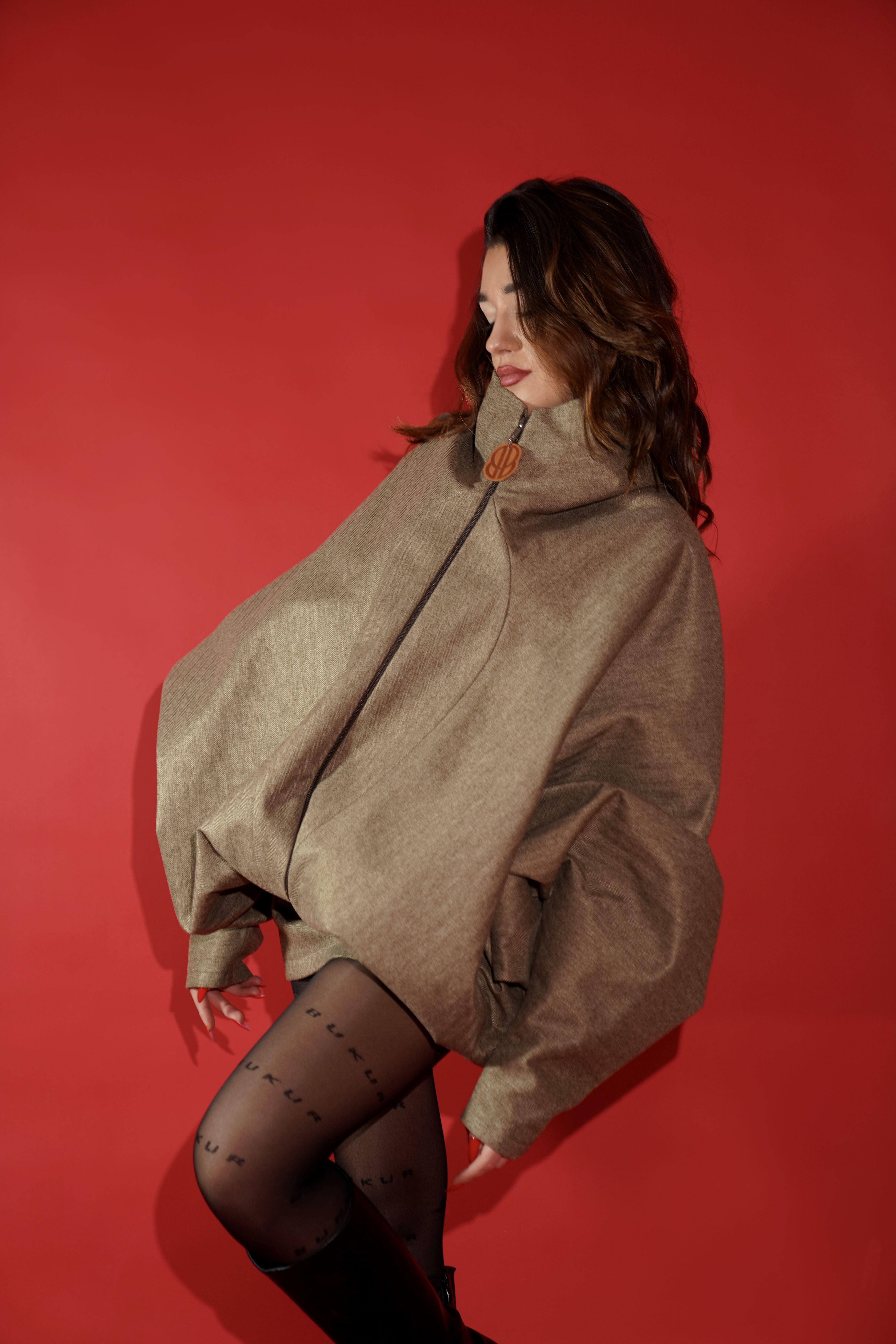 Xhaketë oversize nga Bukur kombinon komoditetin me stilin avangard. Prerja voluminoze dhe materiali i butë në ngjyrë beige i japin një pamje moderne dhe të ngrohtë. Jakë e lartë me zip të gjatë dhe detaji i logos në pjesën e përparme e bëjnë këtë xhaketë një pjesë statement, perfekte për një look urban dhe të veçantë.